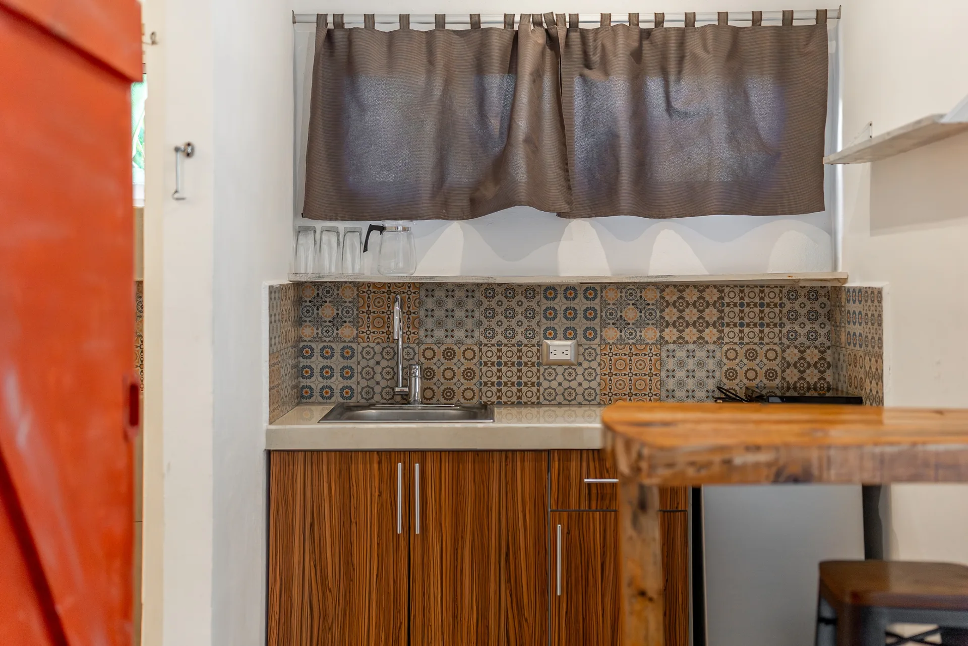 A terrace provides access to a fully independent studio, which features its own full bathroom and kitchenette, as well as to the main house.