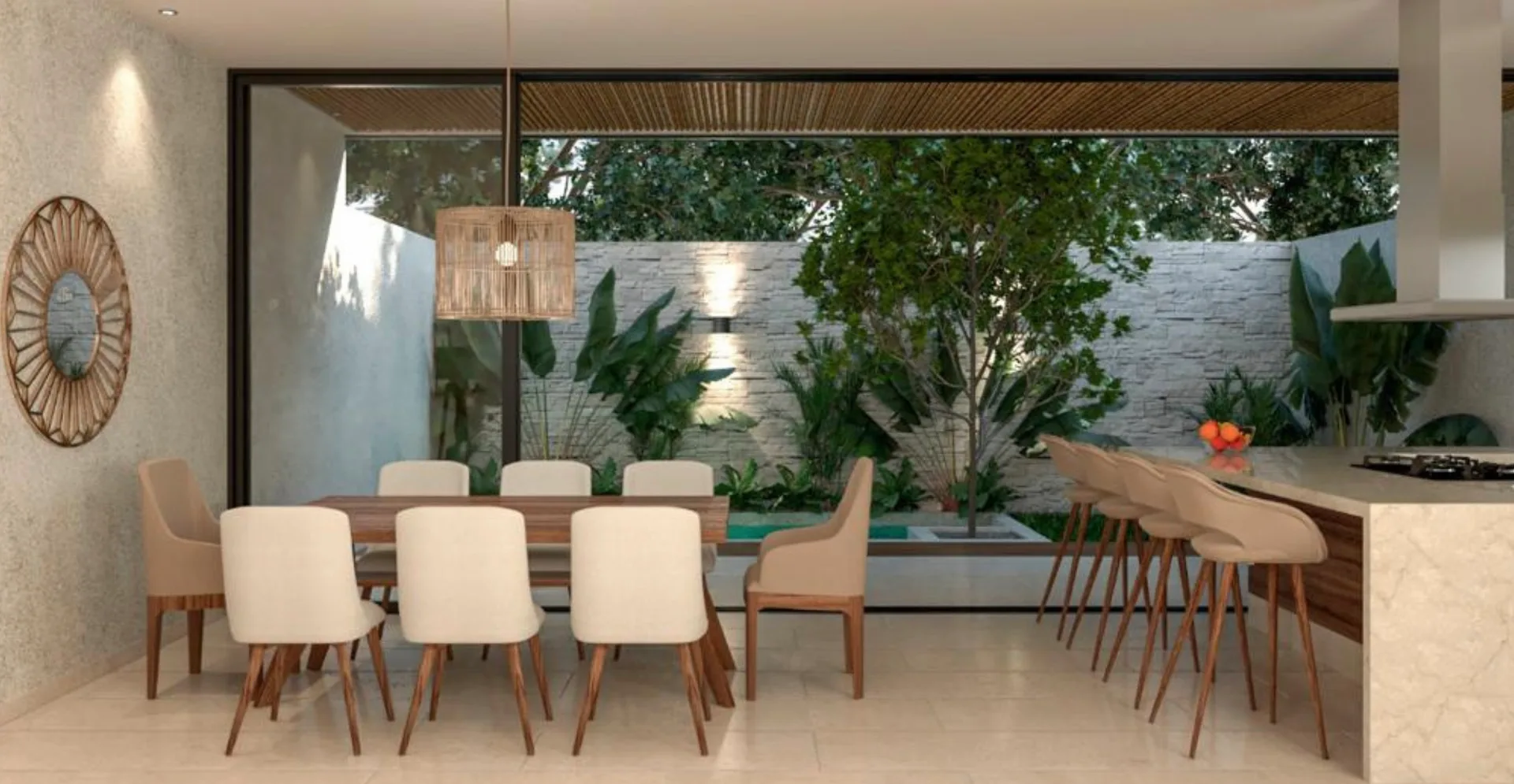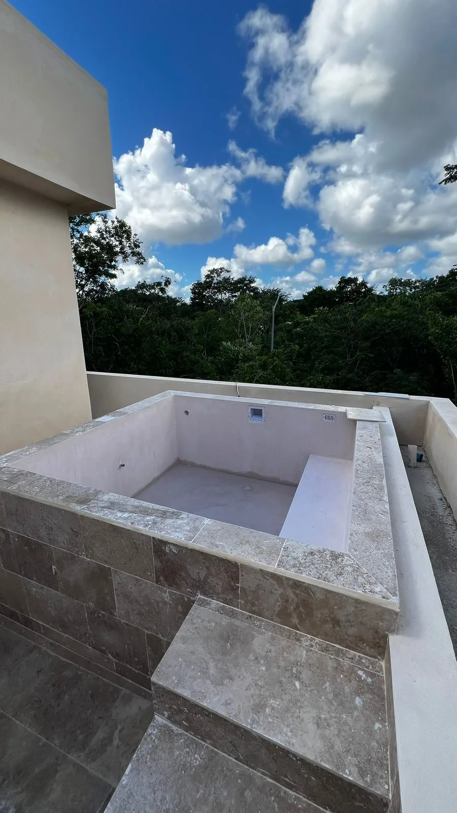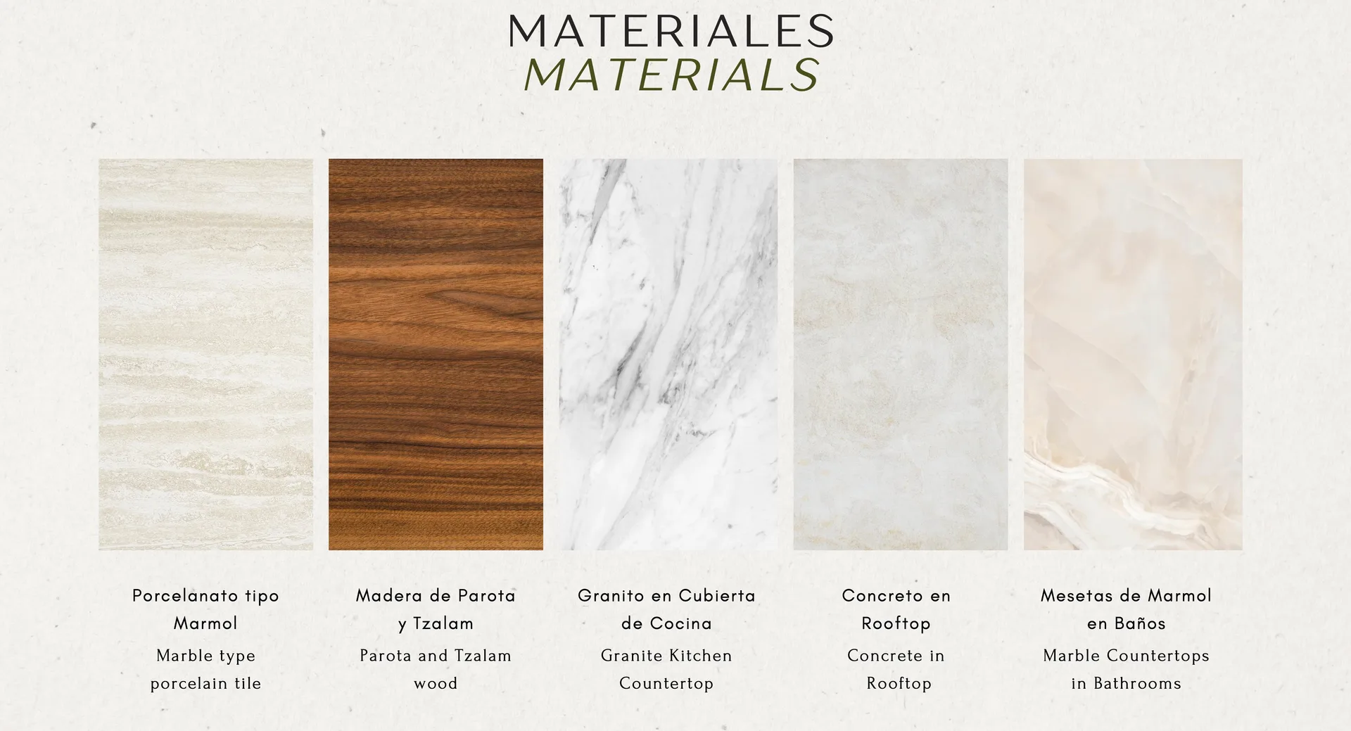 Premium finishes include marble-type porcelain tile, Parota and Tzalam wood, granite kitchen countertops, and marble bathroom vanities. The rooftop is constructed with concrete.