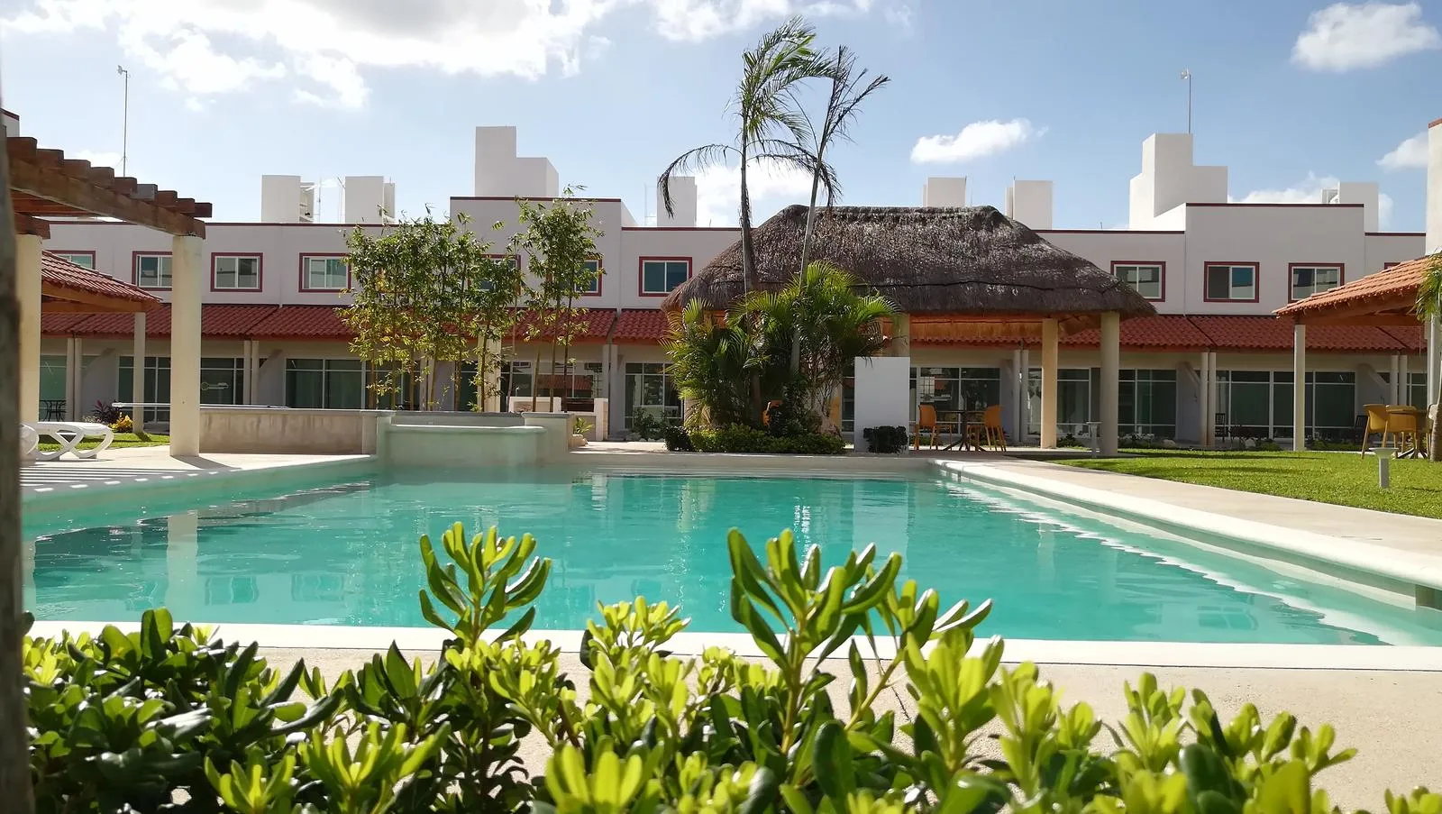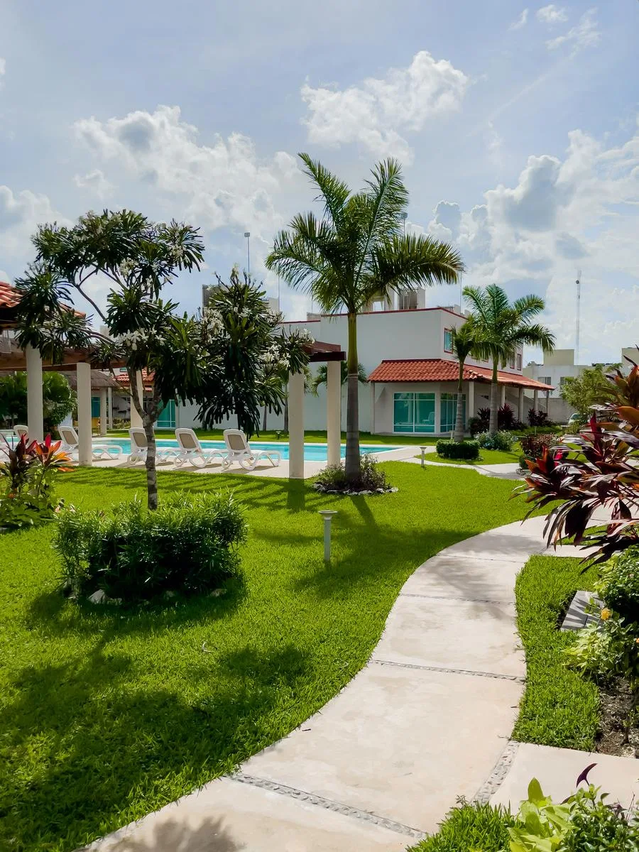 The development offers a pool with sunbathing areas, an outdoor gym, a children's playground, palapas, and green areas. Security features include a booth with cameras, controlled access, and independent private streets.