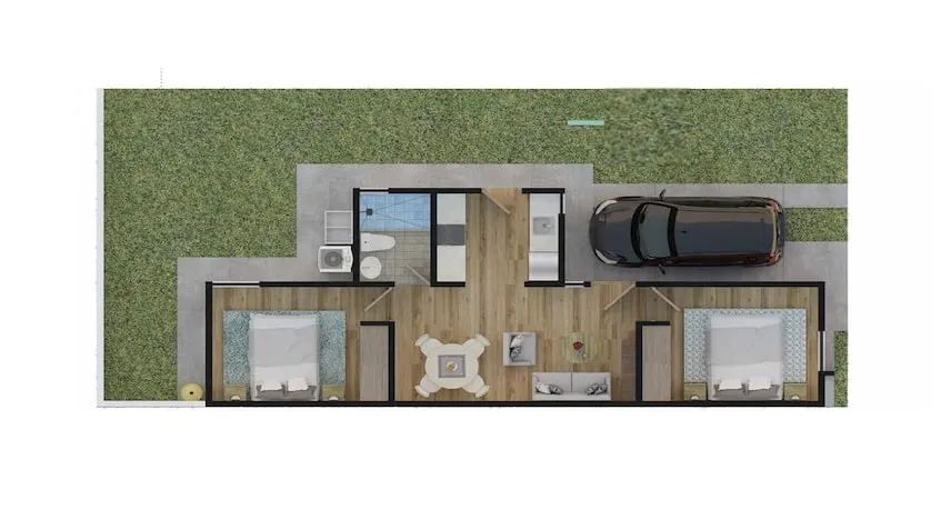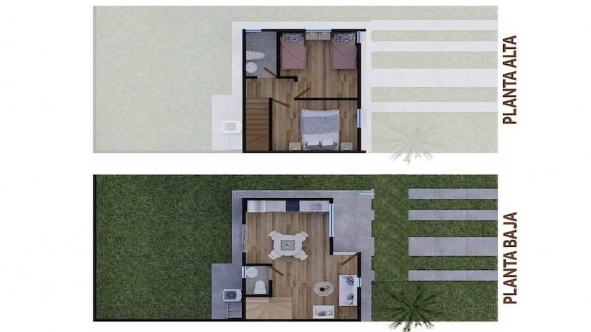 Several home models are available. The Nicté model offers 68. 42 square meters of construction on a 128 square meter lot. The ground floor includes a living room, dining room, kitchen, a half bathroom, laundry room, parking for two cars, a 40 square meter backyard, and a service hallway. The upper floor contains two bedrooms and one full bathroom. An expansion option is available.