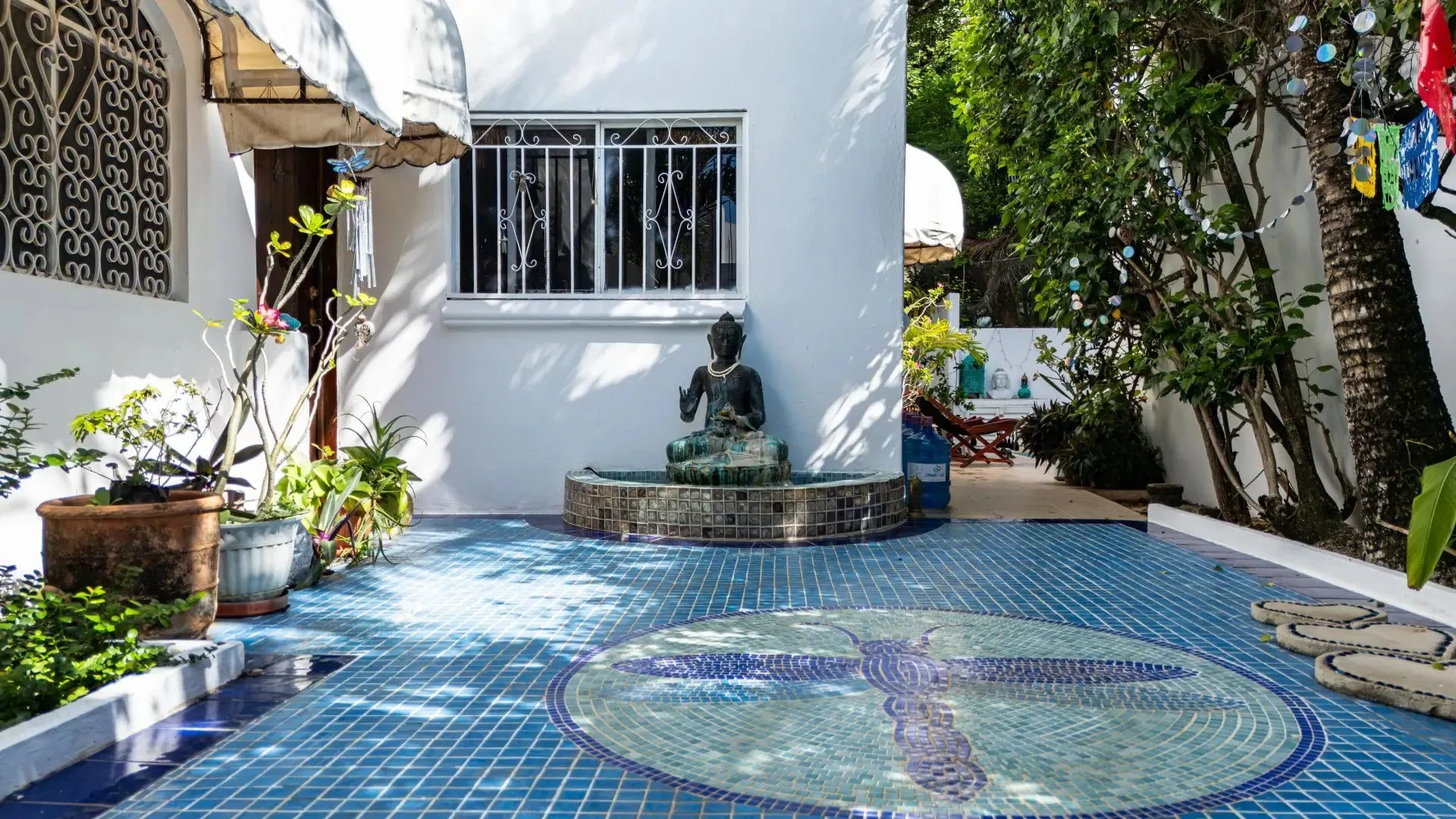 The architectural style is bohemian, artistic, and timeless. The entrance is lined with mosaic, accompanied by a softly flowing fountain and layered greenery.
