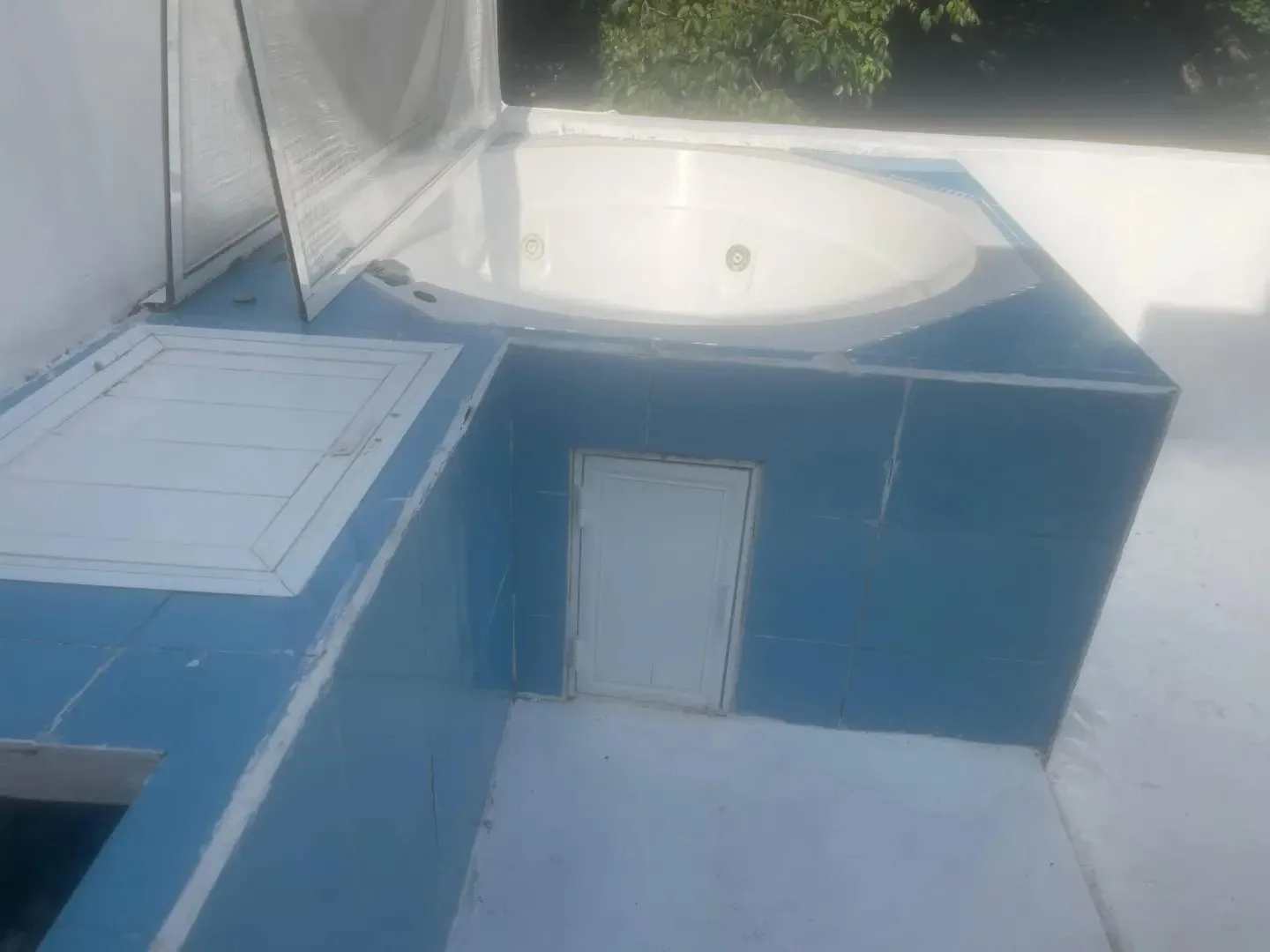 The main house covers 148 square meters and features three bedrooms, two bathrooms, and a generous living area that opens to a lush garden. A rooftop terrace with a jacuzzi overlooks a central park filled with mature trees. A private oasis-style swimming pool is situated between the house and the apartment building.