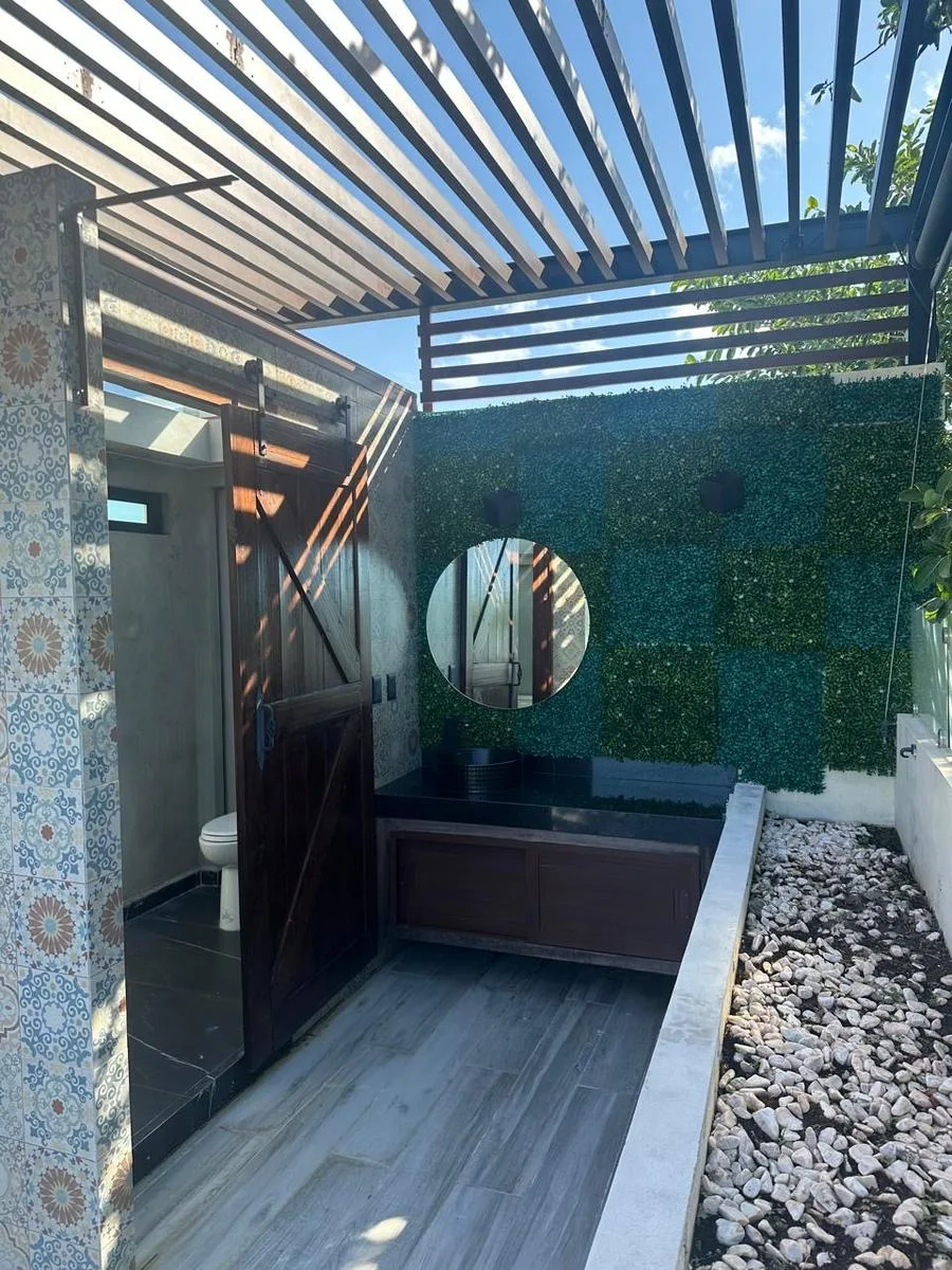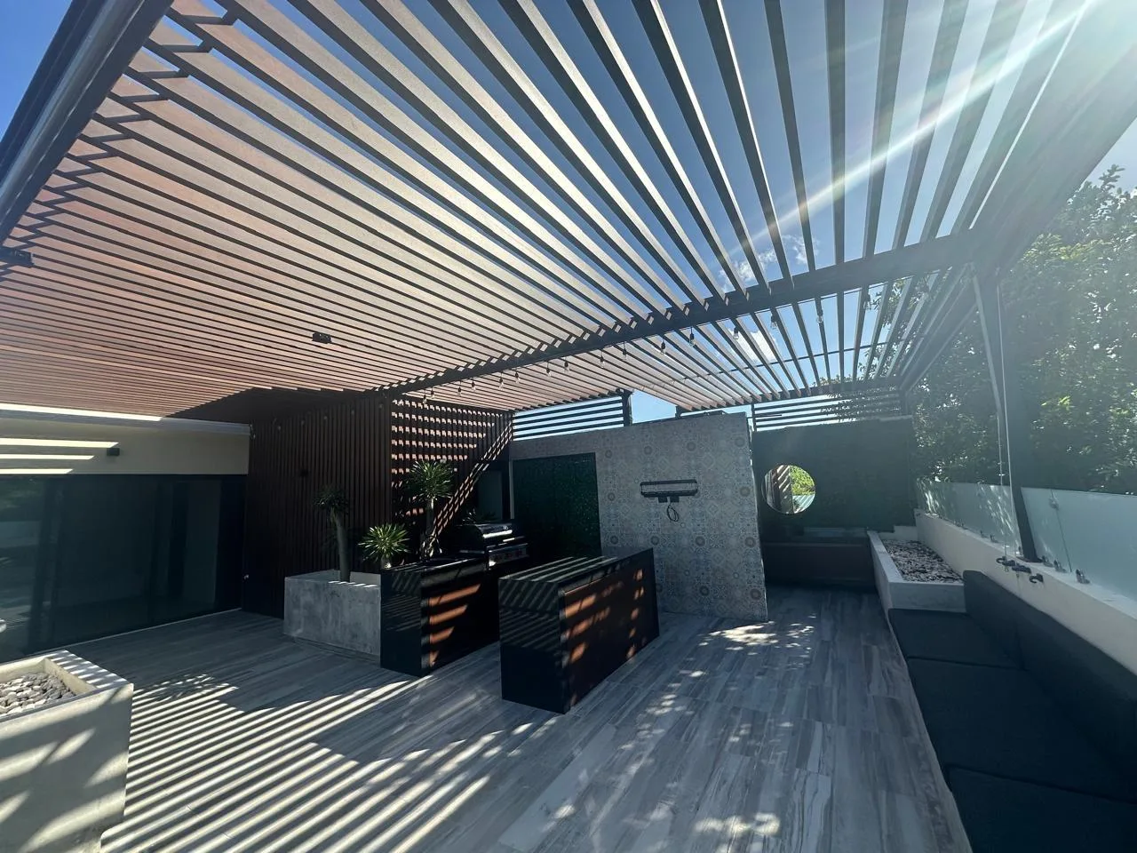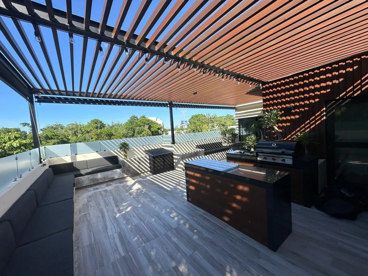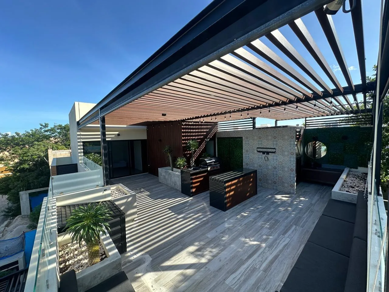 A standout feature is the spectacular rooftop terrace equipped with a pergola, grill, planters, and a half-bathroom. It includes an integrated projector, making it perfect for outdoor cinema nights and gatherings.