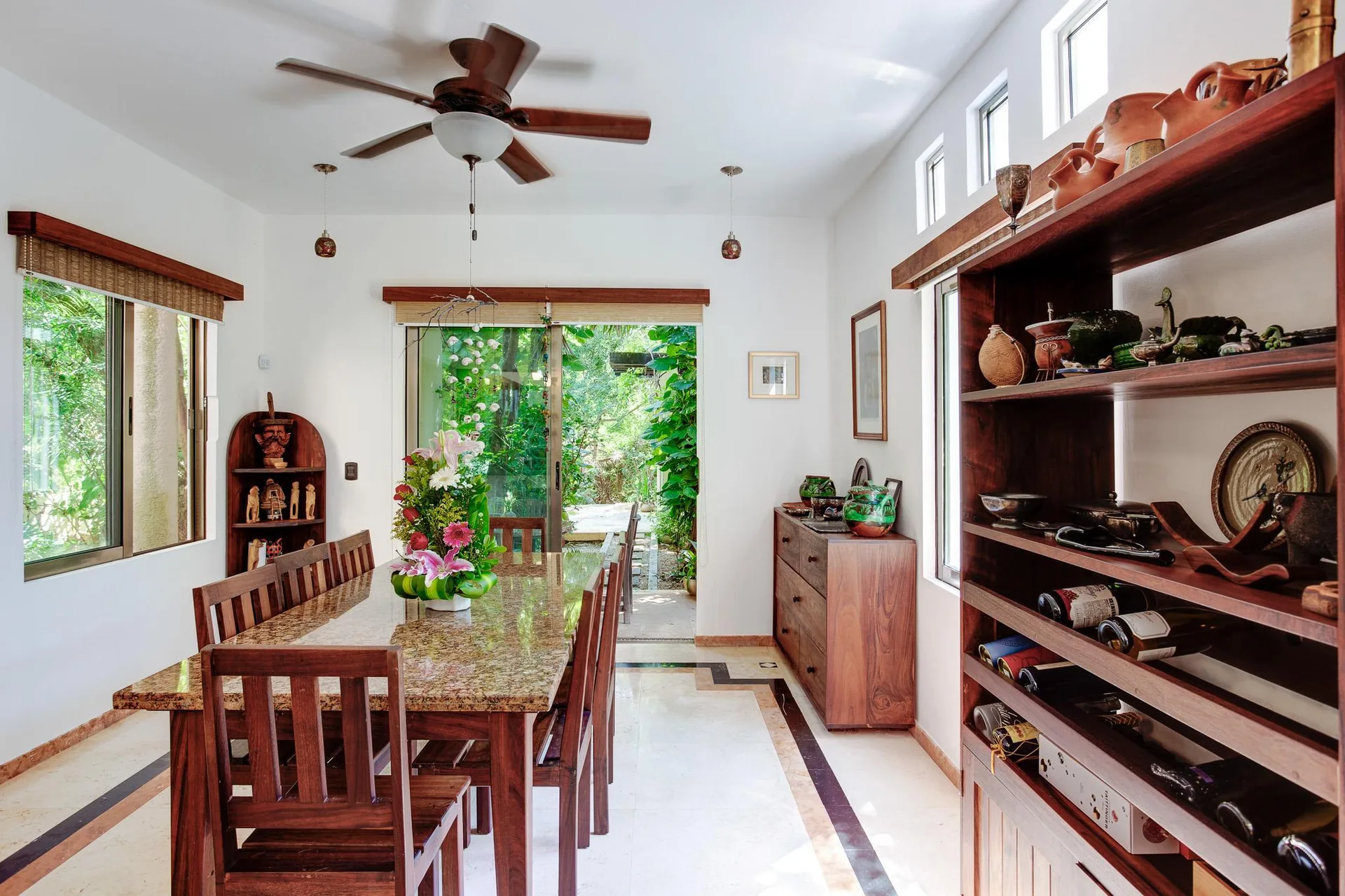 The residence includes four main bedroom suites and one service bedroom, accompanied by four full bathrooms and 1. 5 service bathrooms. The home offers direct views of Caleta Yalku and a private swimming pool. Construction features premium finishes including marble, granite, and tsalam wood.