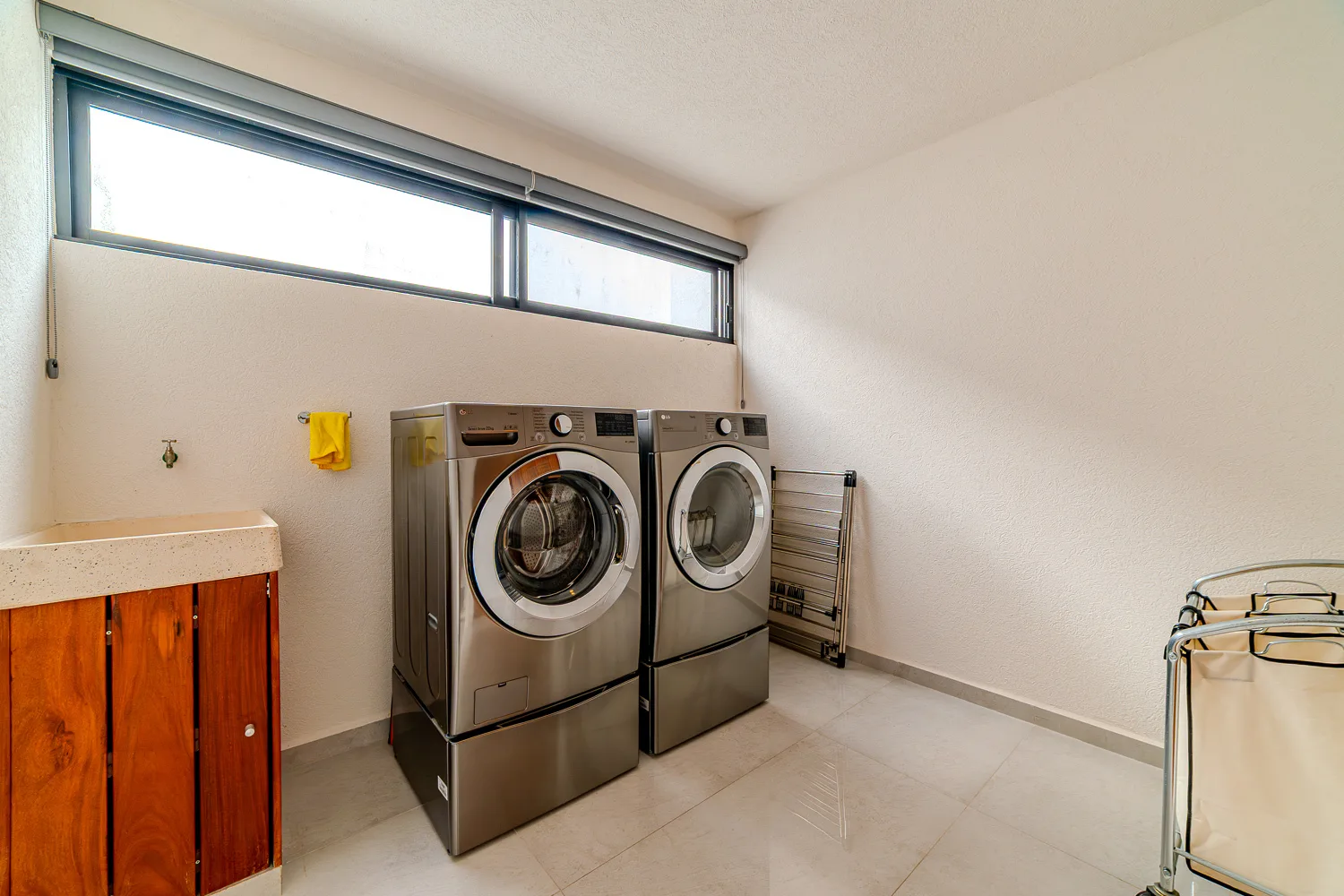 On the second floor are three bedrooms, each with its own wardrobe and private bathroom, along with a laundry room.