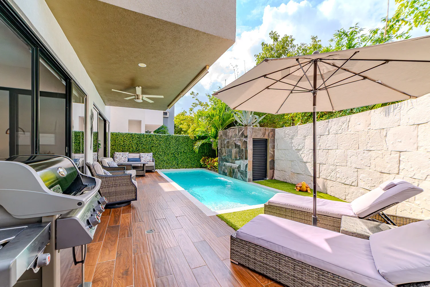 The house features 3 bedrooms and 3. 5 bathrooms, with a total land area of 214 square meters and a built area of 282 square meters. The ground floor includes a fully equipped kitchen, a dining room, and a living room with an electric fireplace beneath the television, creating a pleasant atmosphere. There is a second dining area, a half bathroom, and a terrace with external sun curtains for protection from the afternoon sun. A private swimming pool includes a decorative fountain.