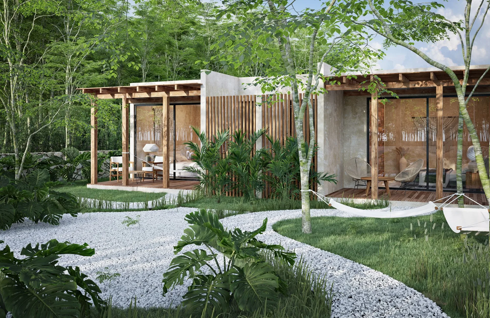 The house is located in a gated community with cenotes in Xpu-ha, Quintana Roo. It is situated in an area between Playa del Carmen and Tulum, surrounded by nature.