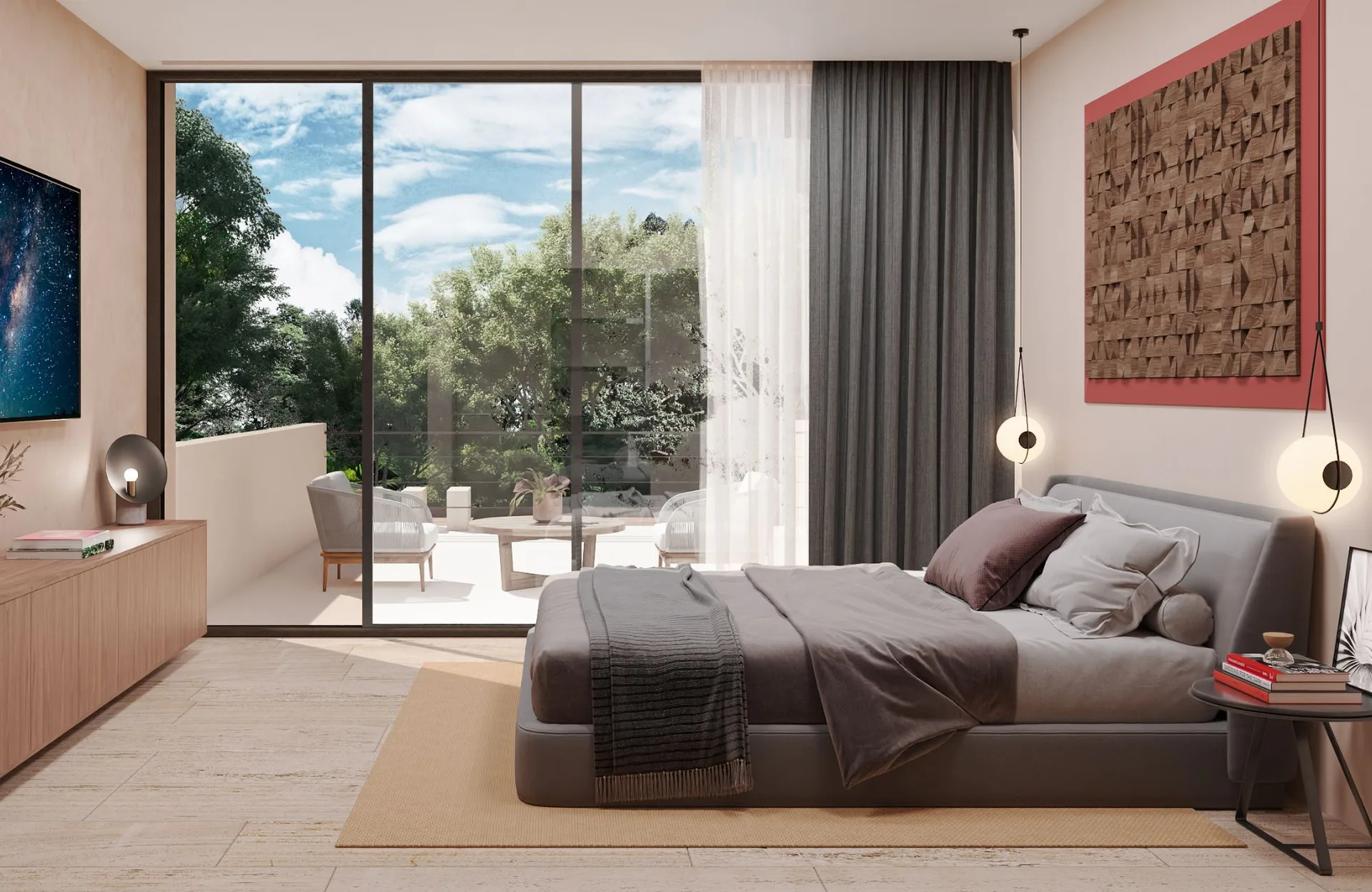 The surrounding development provides extensive amenities. These include a semi-olympic pool, an adult pool, a children's pool, cenotes, a Central Park, and a clubhouse. There is a lounge bar, kids club, co-working lounge, event auditorium, terraces and gardens, and a wellness center with a yoga room and massage rooms. Additional facilities include a temazcal, water circuits, a jogging path, bike paths, a skate park, and a high-performance sports center with a soccer field and tennis and paddle courts. There is a professional gym with bathrooms and lockers, an ambulatory medical center, a gastronomic center with a farm-to-table garden, and a native jungle interpretation center. The community features controlled access, 24/7 interior security, a pet park, and scheduled transportation services.