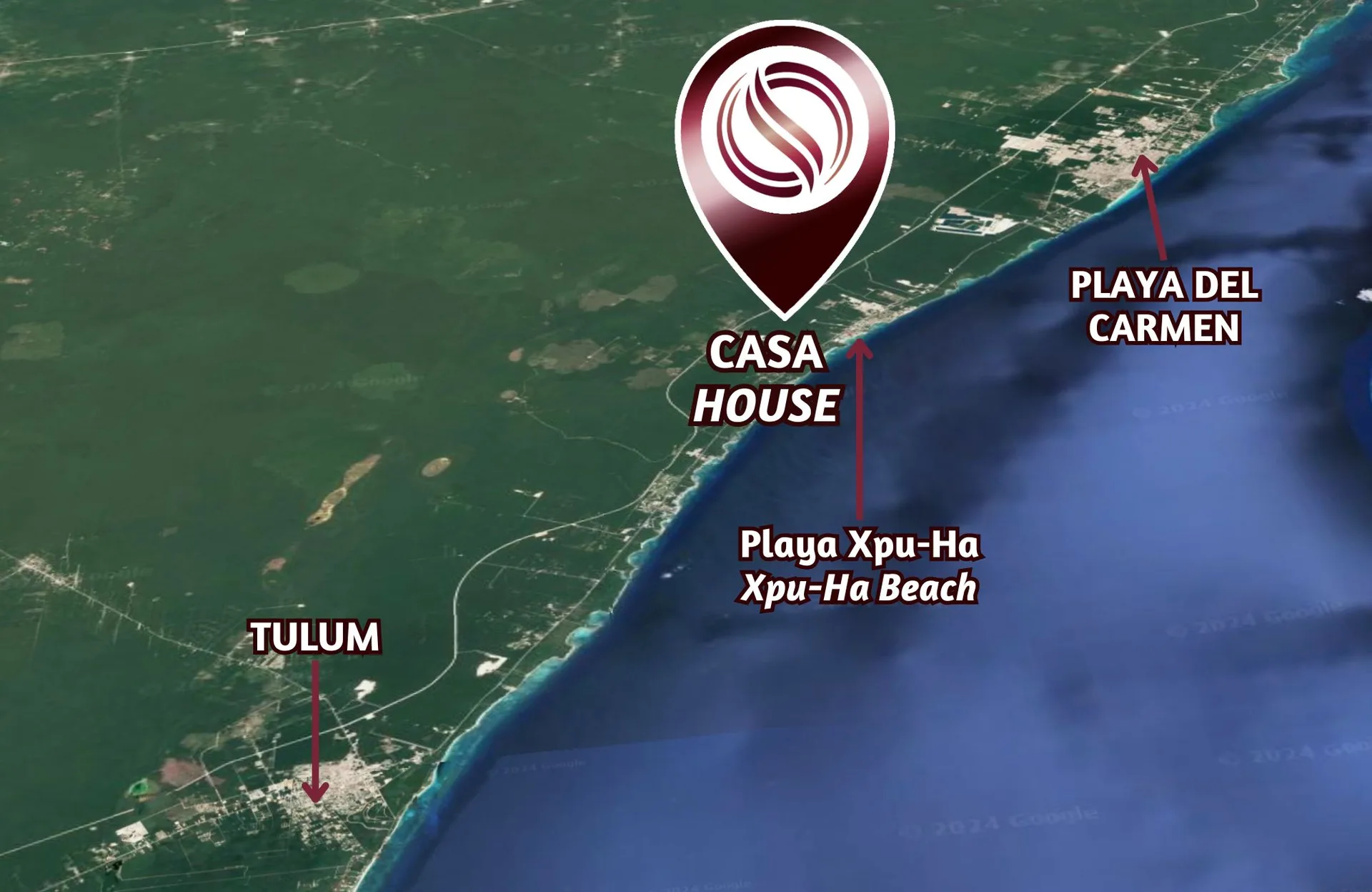 The house is situated between Playa del Carmen and Tulum in Quintana Roo, Mexico. It is approximately 10 minutes from Xpu-ha Beach, 30 minutes from Playa del Carmen, 35 minutes from Tulum, and 60 minutes from the International Airport of Tulum and Cancun.