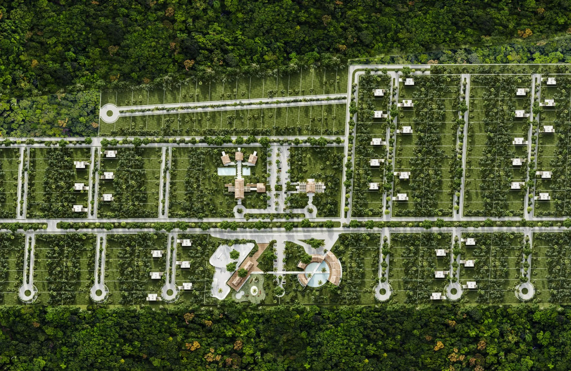 The property is located in a serene area between Playa del Carmen and Tulum, surrounded by nature and tranquility. It features a modern design with spacious layouts.