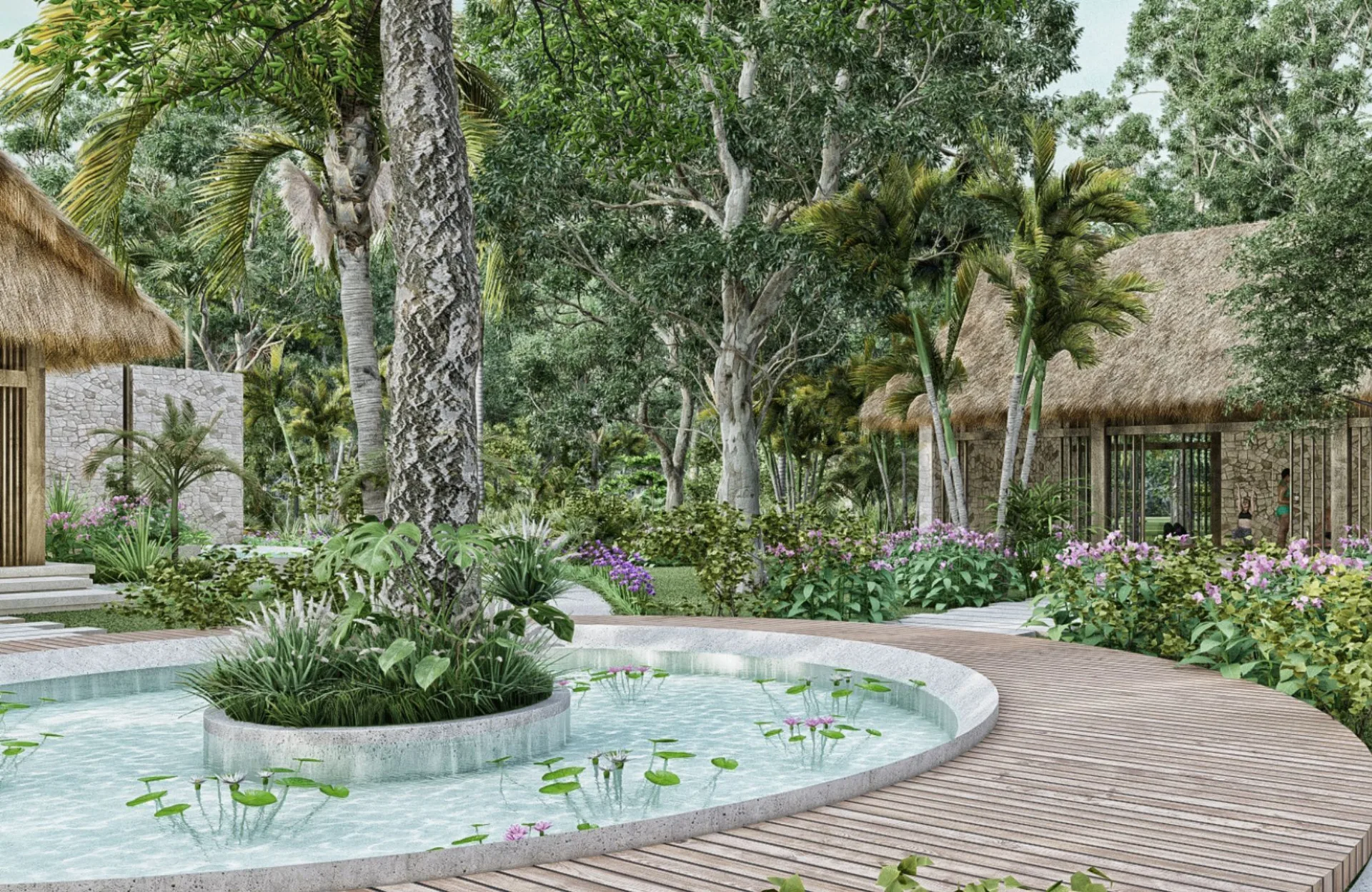The community features a semi-Olympic swimming pool, an adults-only pool, and a children's pool. Amenities include a cenote, central park, clubhouse, lounge bar, kids' club, co-working room, event hall, terraces and gardens, and a wellness center with a yoga room and massage rooms. There is a Temazcal, water circuit trails, running and bicycle paths, a skate park, a high-performance sports center, a soccer field, and tennis and paddle courts. A professional fitness center with bathrooms and changing rooms, an outpatient medical center, a gastronomic center and "Farm to Table" garden, and an indigenous jungle interpretation center are also present. The community offers controlled access, 24/7 internal security, a pet park, and scheduled transportation services.