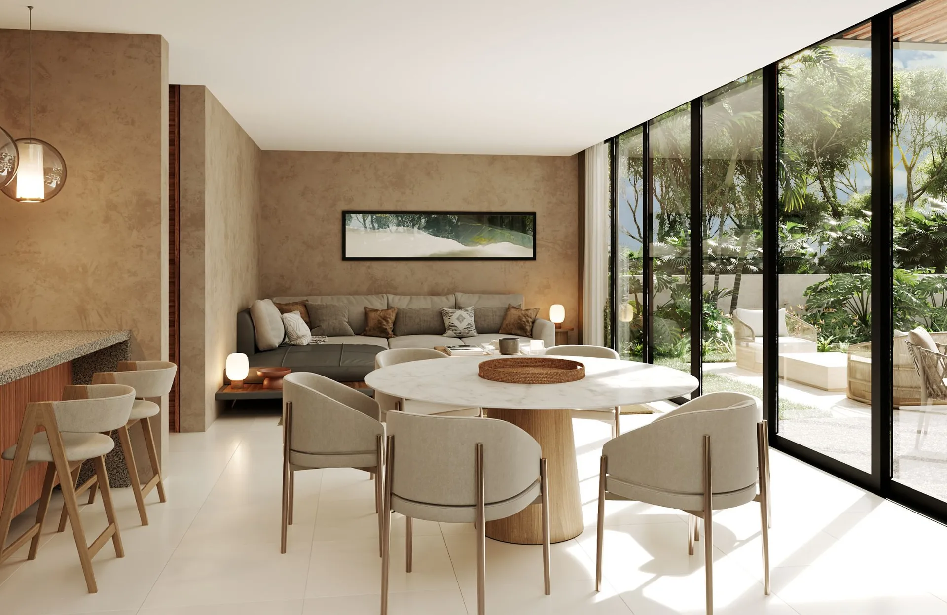 The property offers stunning views of the Mayan jungle. A studio apartment with a full bathroom may be available. The bedrooms feature ensuite bathrooms and terraces. Private parking is available for two cars. The homes are available for customized upgrades.