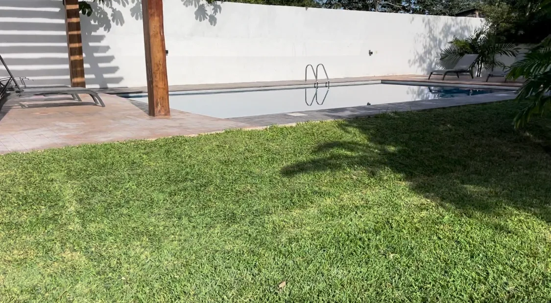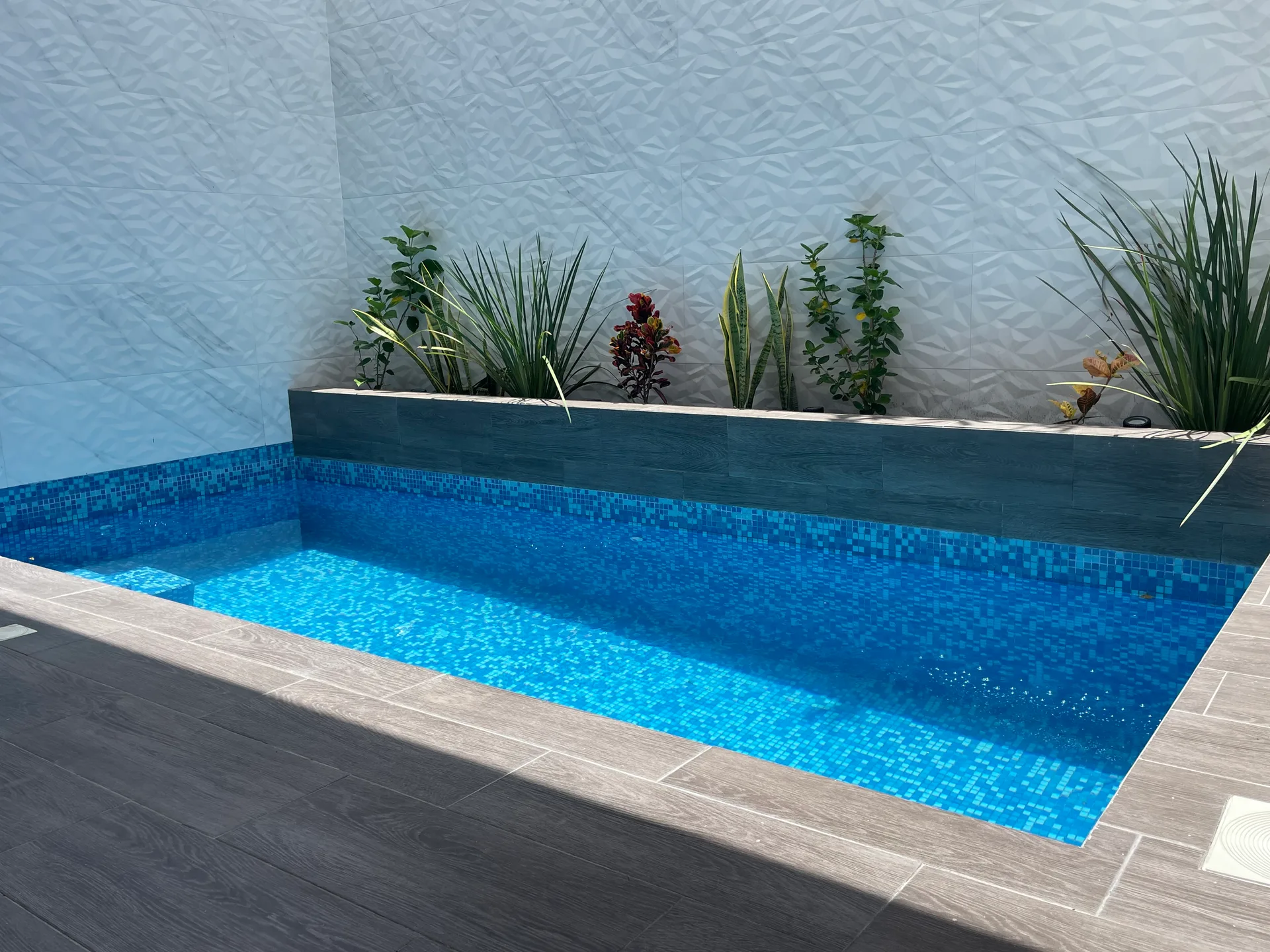 The terrace and roof garden area include a secondary private pool, a barbecue area, and a half bathroom. The property also has a solar panel system, a 4500-liter water cistern, a peripheral water pump, and window screens. Both pools have independent filtration systems. The house is equipped with inverter air conditioning units and is unfurnished.