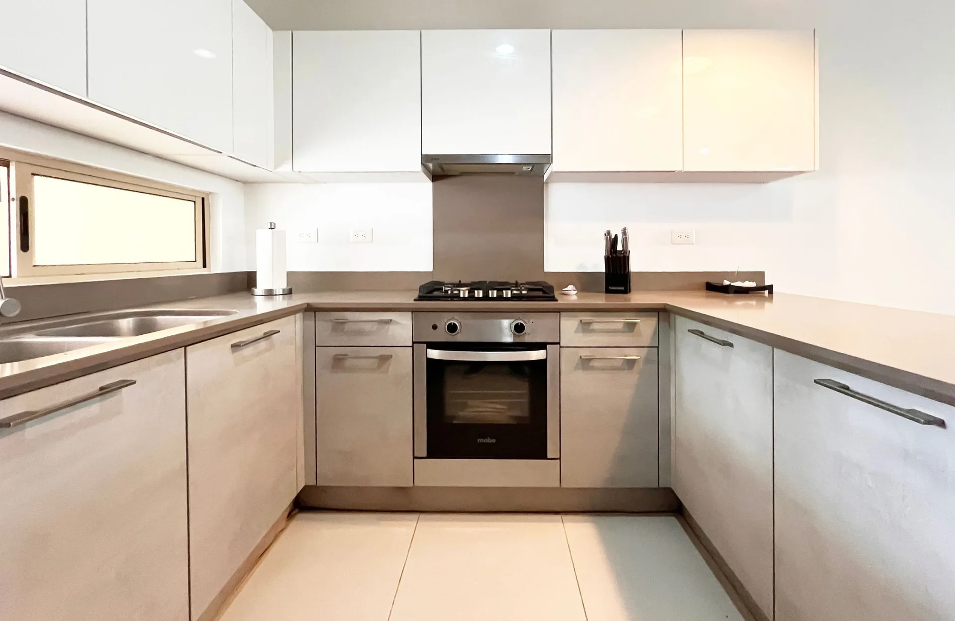 The home is bright and designed to maximize natural light, with an intelligent layout and spacious rooms. It features three bedrooms, each with an en-suite bathroom. European hurricane shutters are installed throughout the property. The interior includes a living room, dining room, and an equipped kitchen. A half bathroom is available for guests. There is covered parking for two vehicles. The house is equipped with 11 solar panels and a reverse osmosis system in the kitchen. The property is fully furnished.