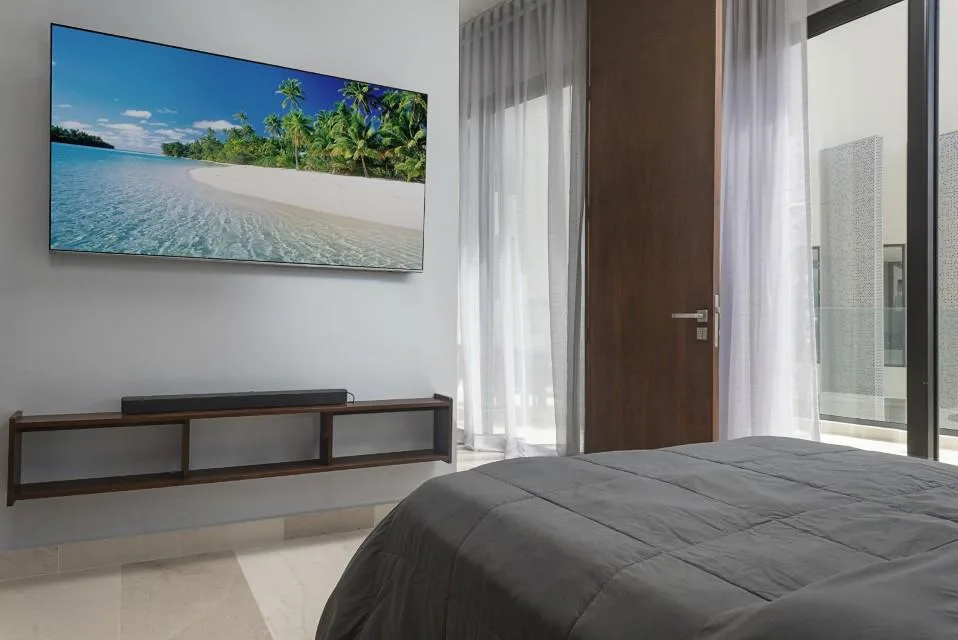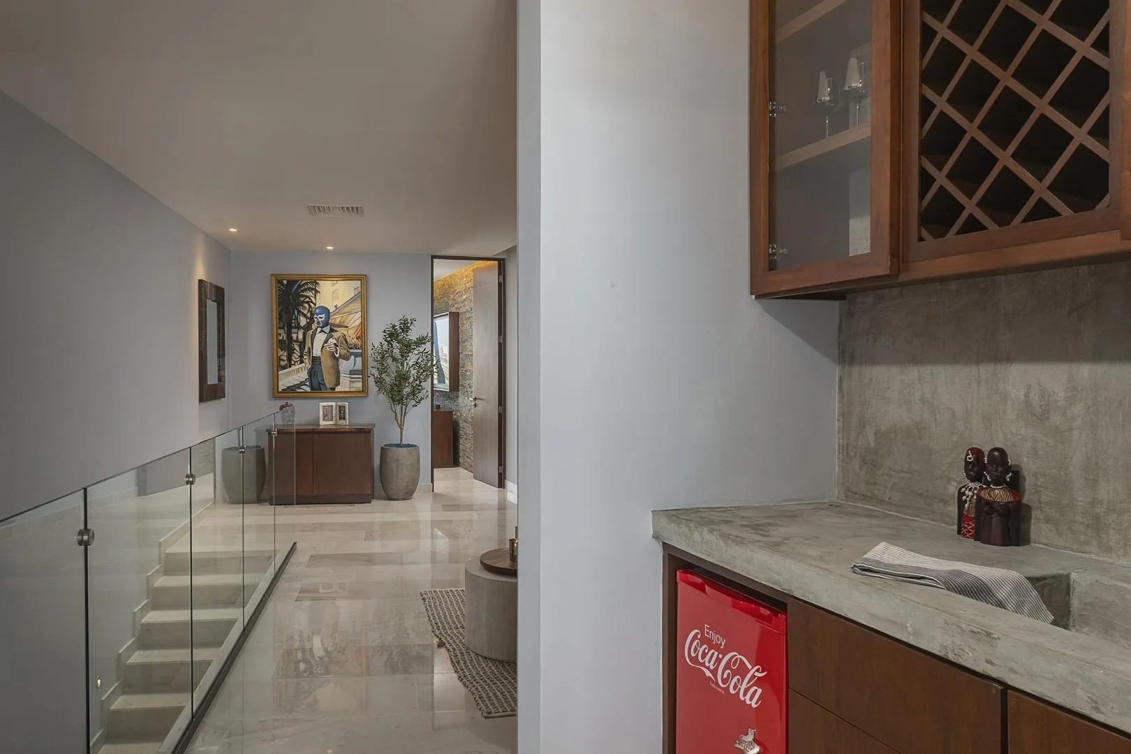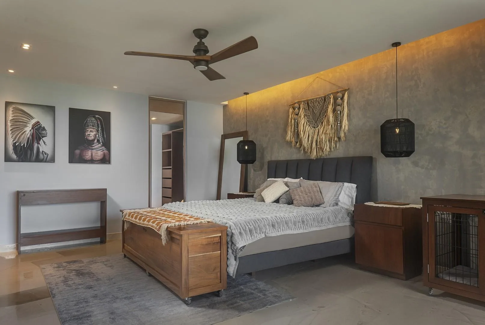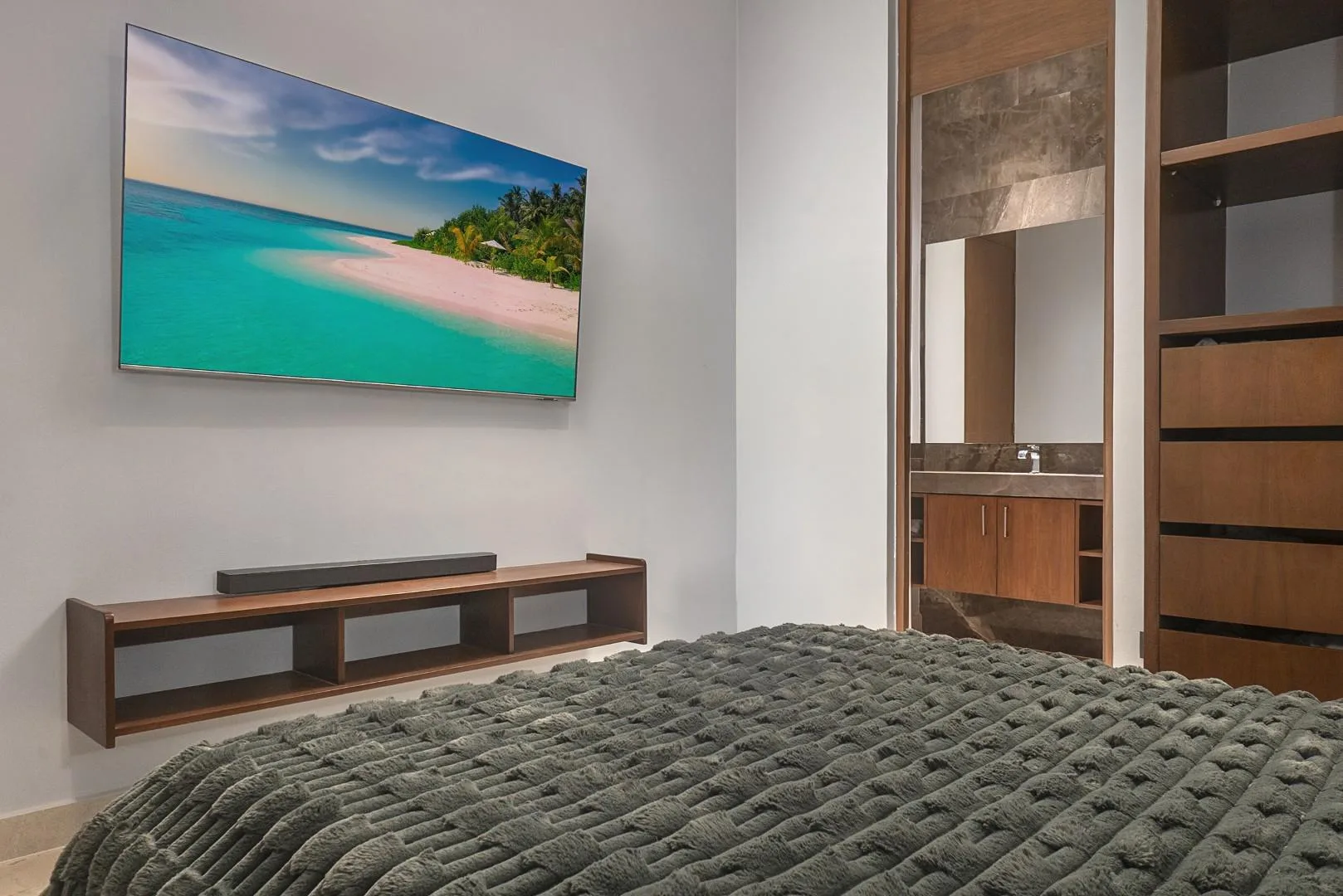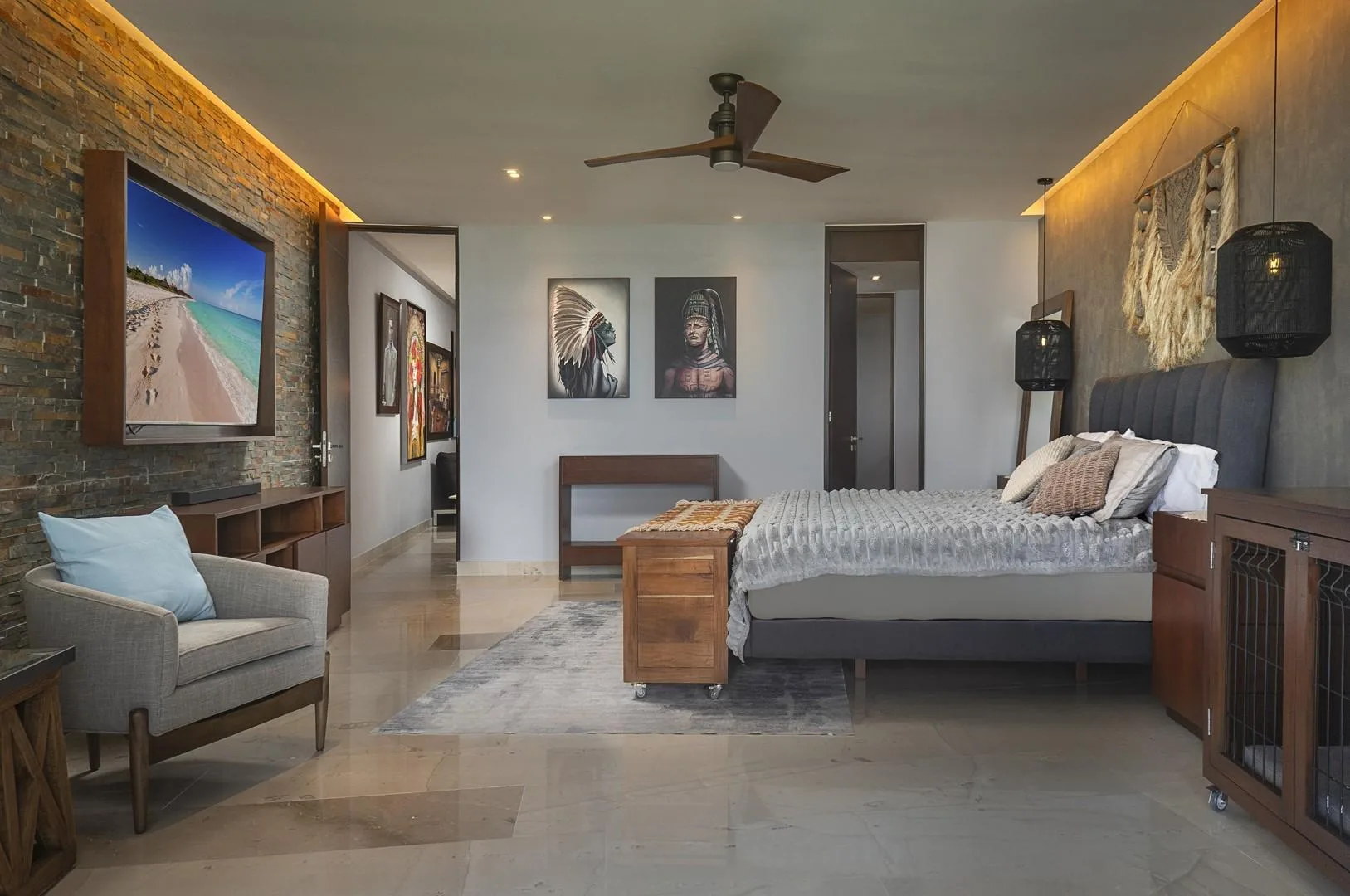 The upper level is dedicated to the expansive primary suite, which offers lush green views and natural light. This level includes a large walk-in closet, a luxurious en-suite bathroom, a full-size private office, and a mini kitchen for convenience. The outdoor penthouse terrace features a plunge pool and lounge areas, creating a serene oasis with uninterrupted views of the Caribbean Sea, the white-sand beach, and the city skyline.
