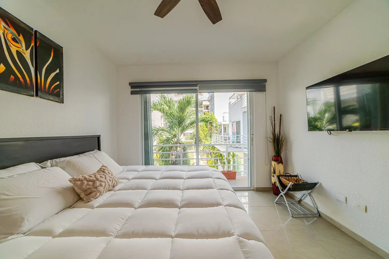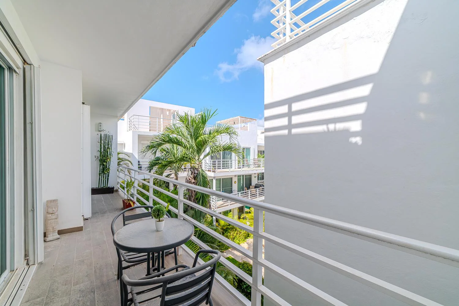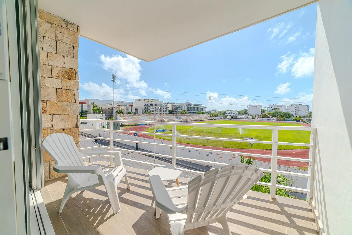 The property features three balconies offering views of the swimming pool and landscaped gardens. The front balcony provides views of the Inter Playa stadium across the street. The spacious living room includes a 55-inch Smart HD TV with cable and high-speed internet connectivity.