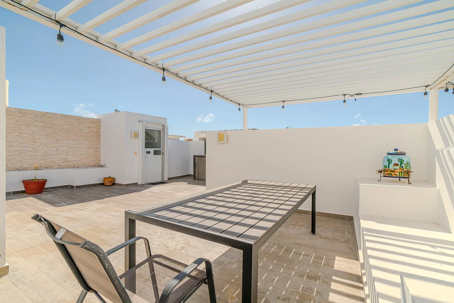This fully furnished two-bedroom penthouse is located on the third floor of Condominium Pelicanos. It offers 104 square meters of interior space complemented by a 43-square-meter rooftop terrace ideal for relaxation and entertaining.