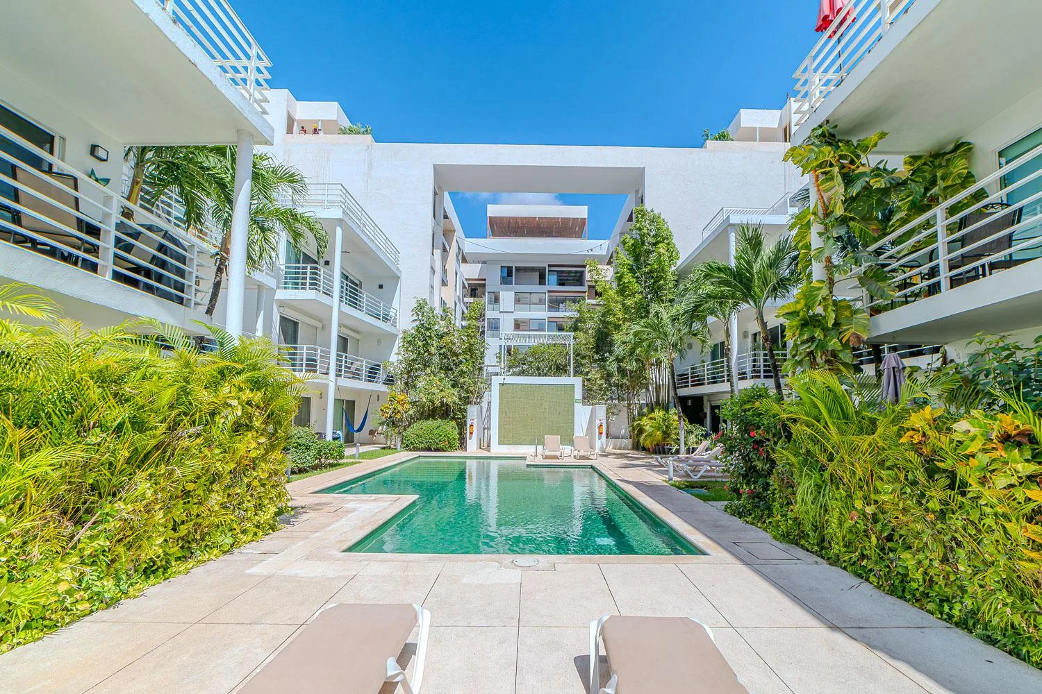 Building amenities include a swimming pool, beautifully landscaped green areas with lounge chairs, and 24/7 security. The location is in the heart of Playa del Carmen, just a few blocks from Fifth Avenue, grocery stores, restaurants, banks, and the beach.