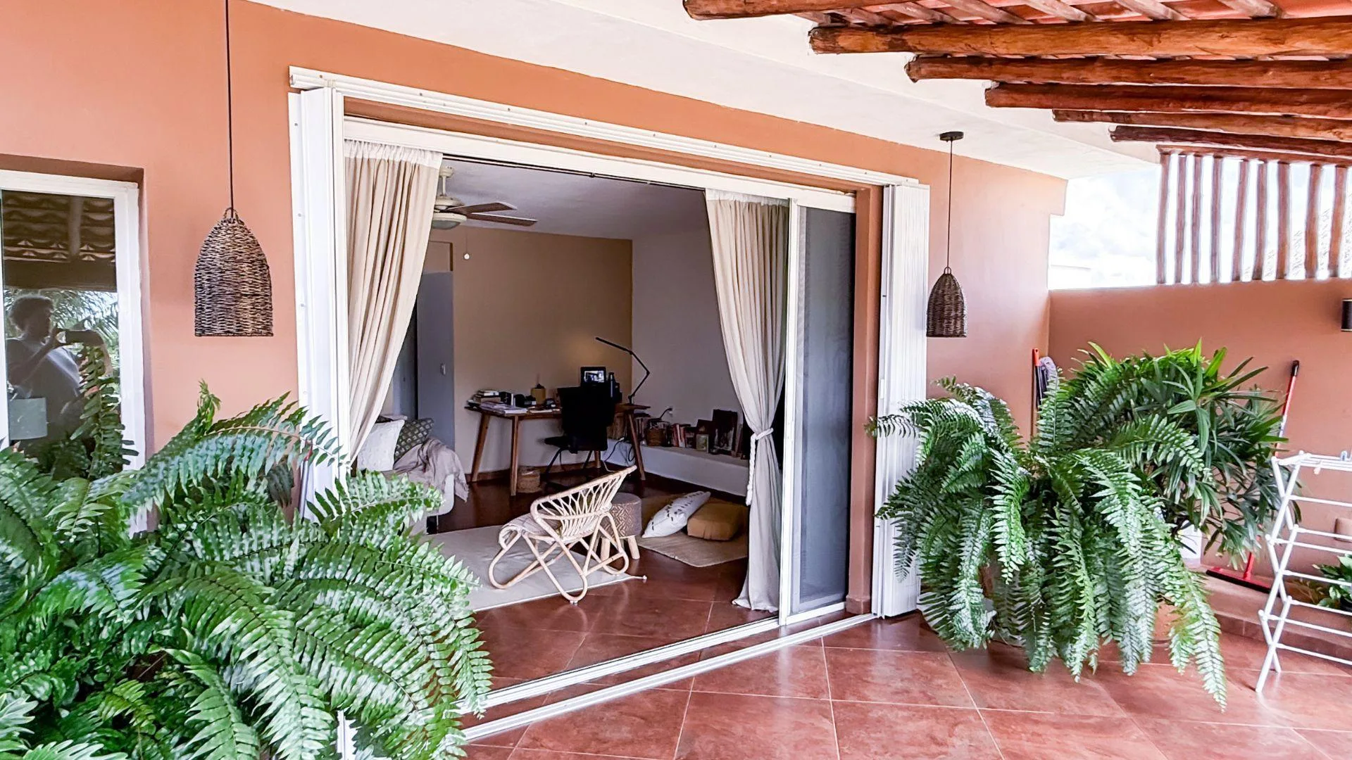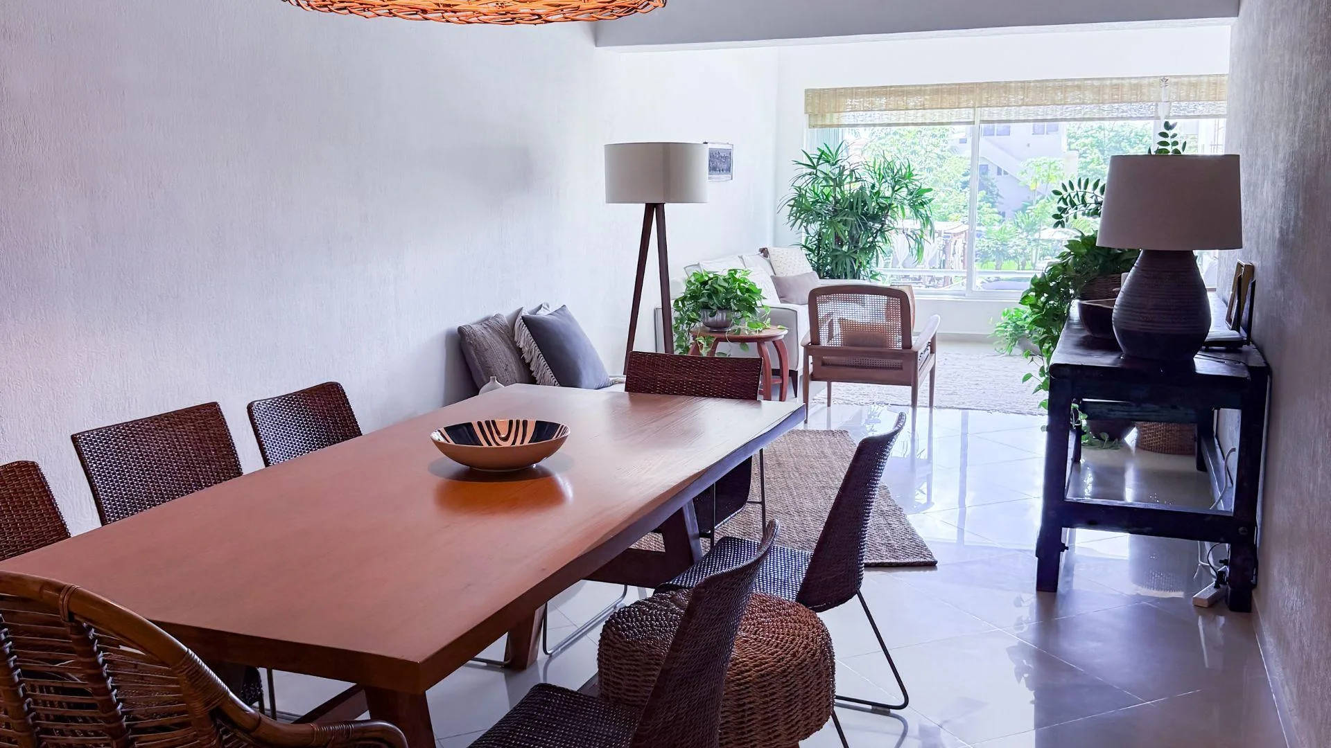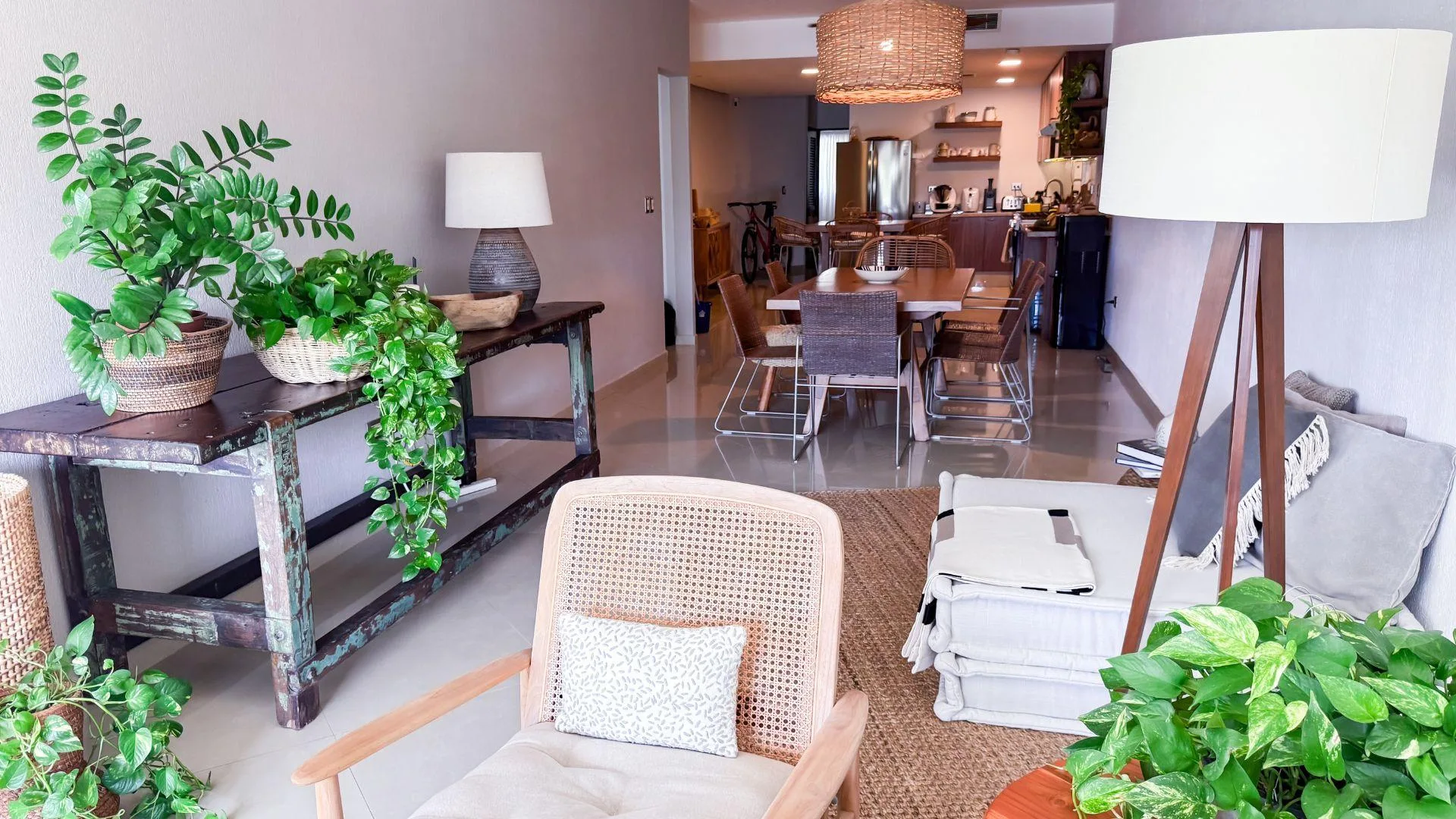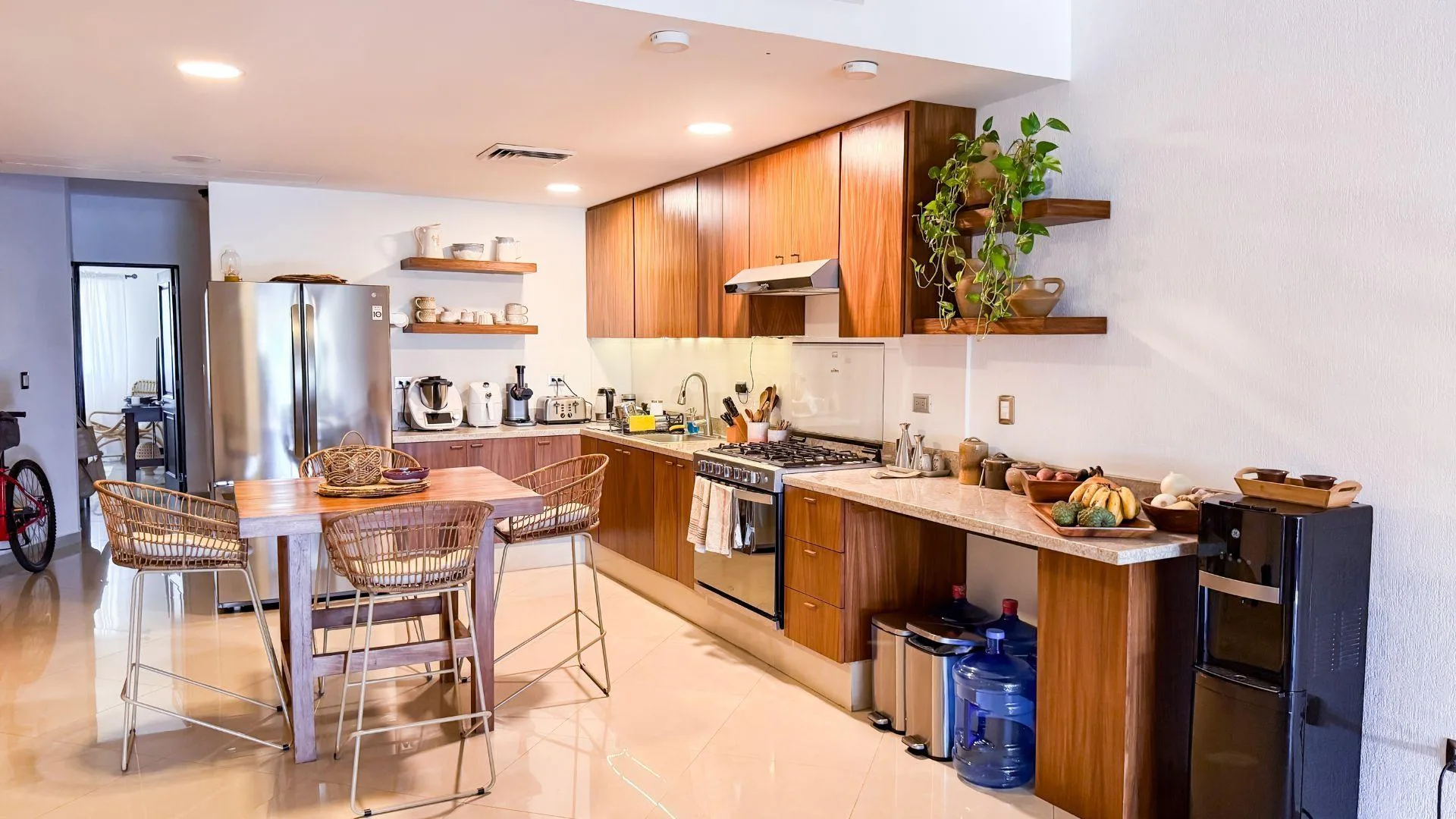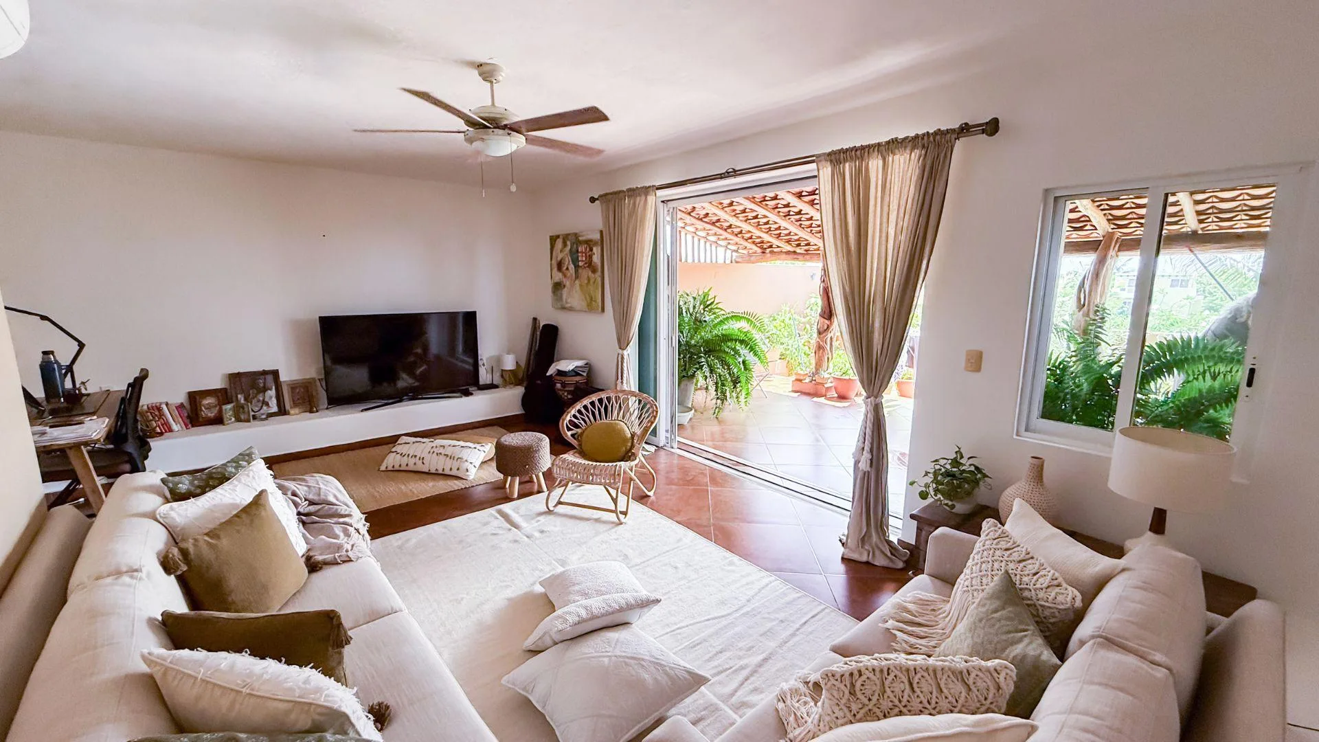 The living and dining area provides access to a balcony and the terrace. The private covered terrace is equipped with a jacuzzi, a palapa, and open-air space. The property includes private covered parking.
