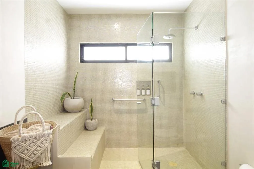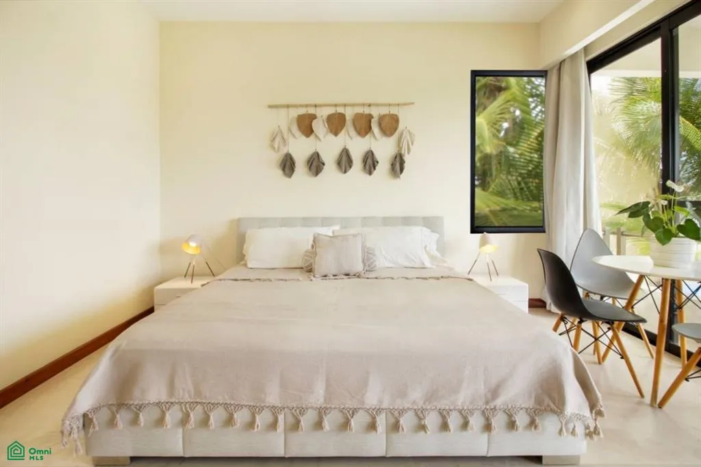 The first level features an open-concept social area. This includes a living room, a dining area with a solid Parota wood table, and a contemporary integrated kitchen. The kitchen is equipped with matte quartz countertops, soft-close cabinetry, and an independent pantry room. This level also includes two large master suites. Each suite has a private bathroom with a minimalist-industrial style, walk-in showers, high-end finishes, and a custom walk-in closet in natural wood with integrated LED lighting. A fully equipped laundry room is also located on this level.