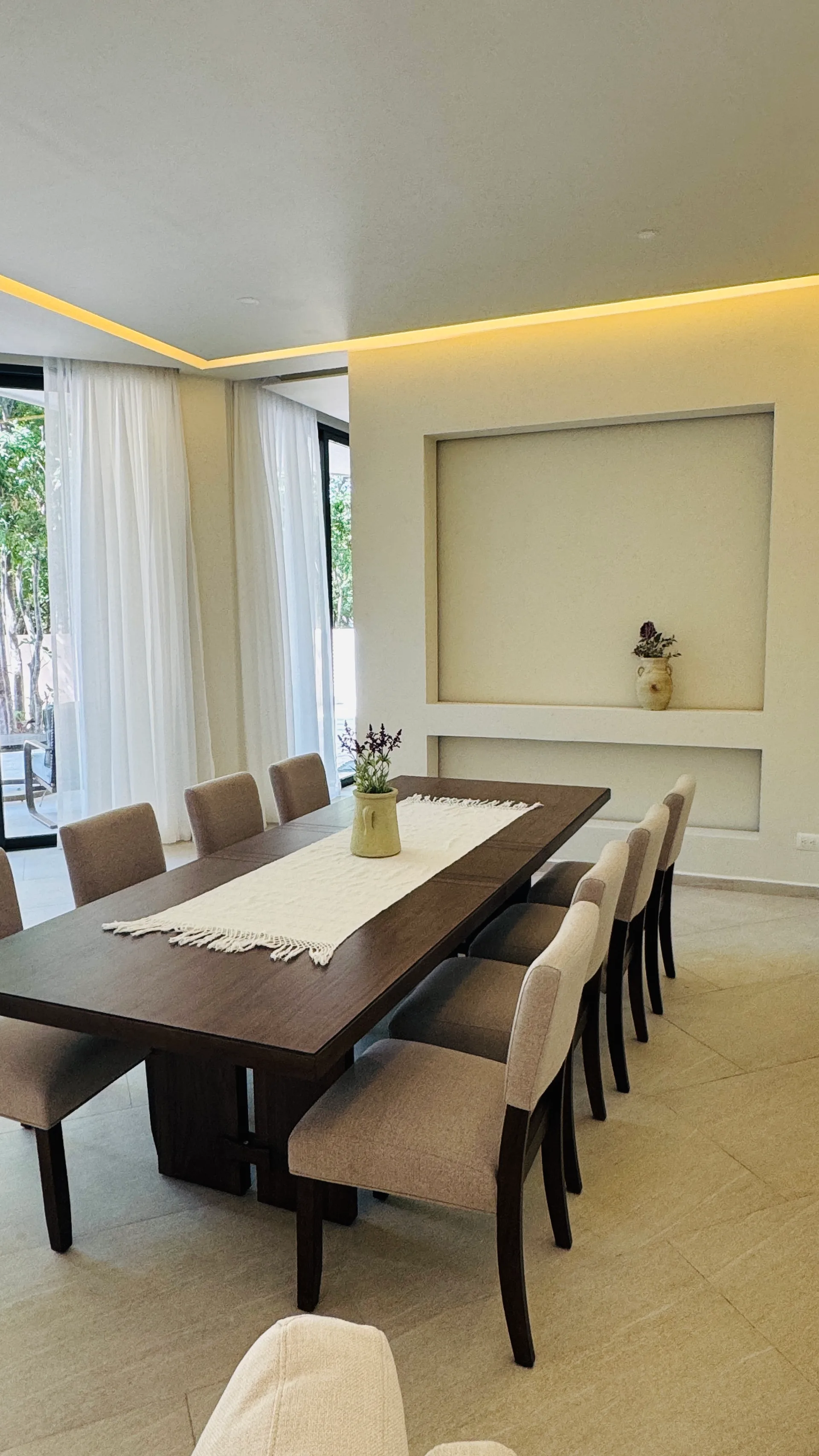 The community is surrounded by nature and features double 24/7 security. Residents have access to a private beach club. The development includes a cenote, gardens, trails, a playground, and courts for tennis, soccer, and basketball. A Montessori school and an express market are located within the complex.