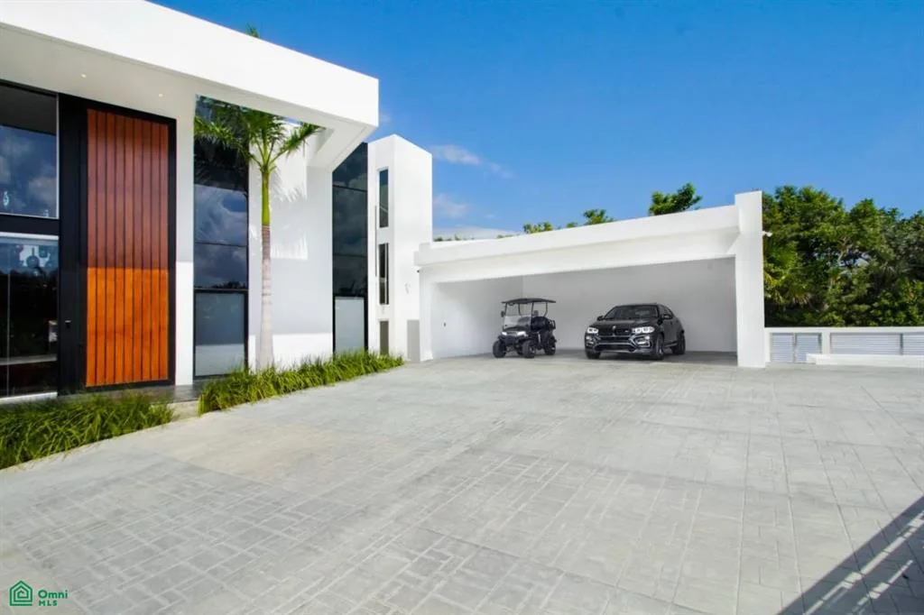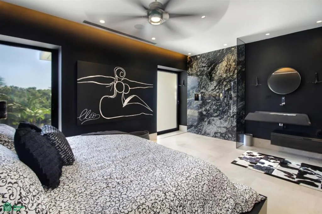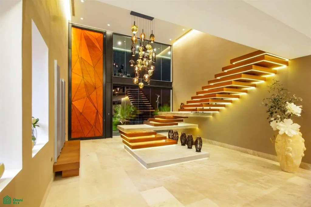 A magnificent 8-meter-high entrance door opens to a double-height foyer featuring a solid wood floating staircase. The residence includes five palatial bedrooms, each with a private en-suite bathroom and a walk-in closet. The home features an integrated smart home system for controlling lighting, climate, security, and entertainment.