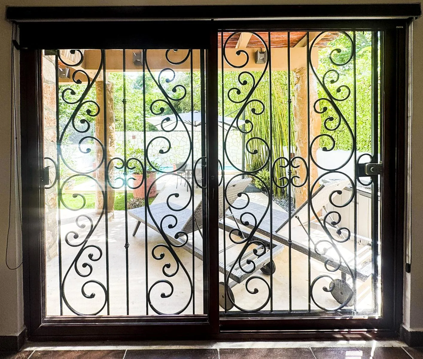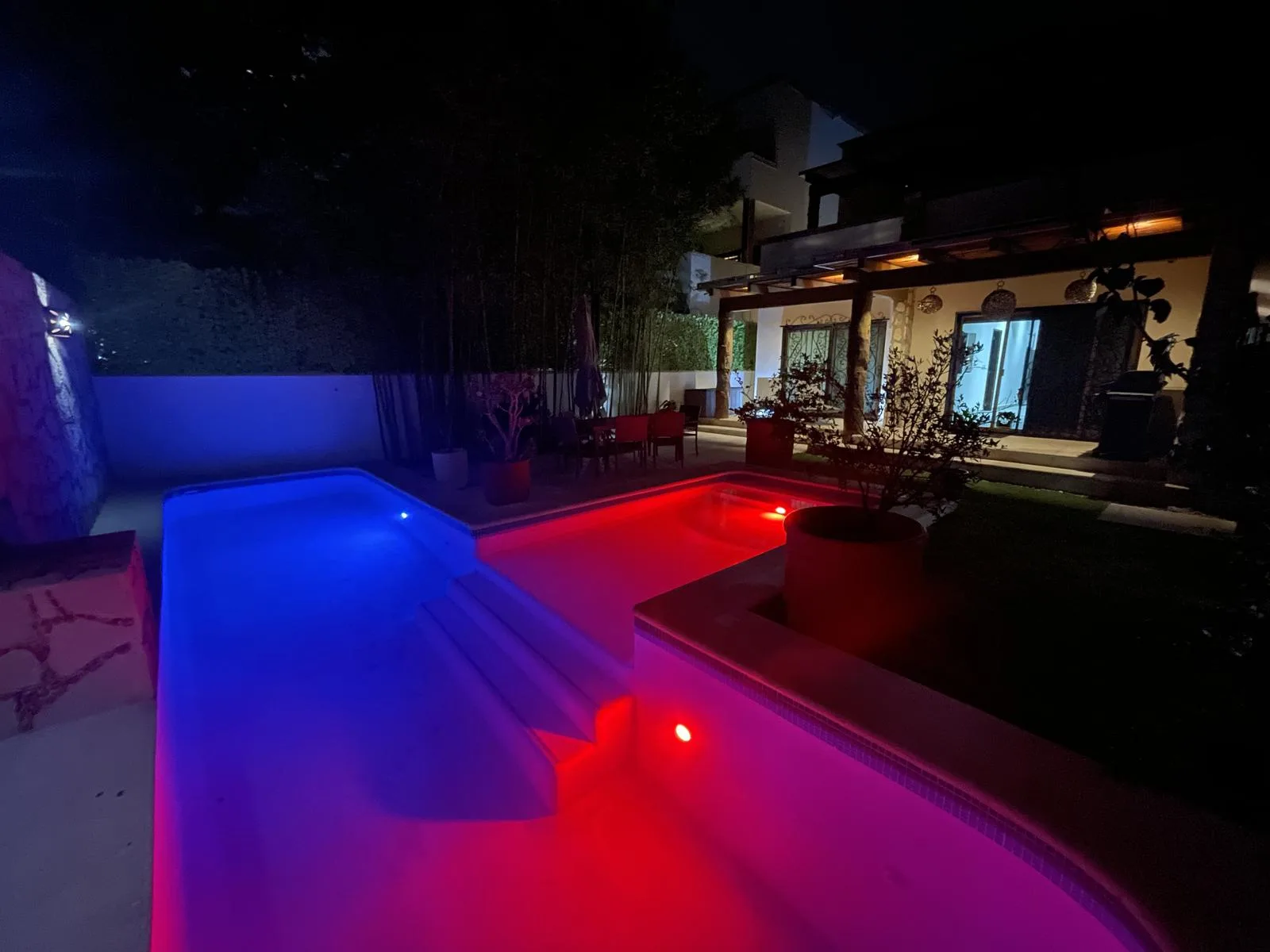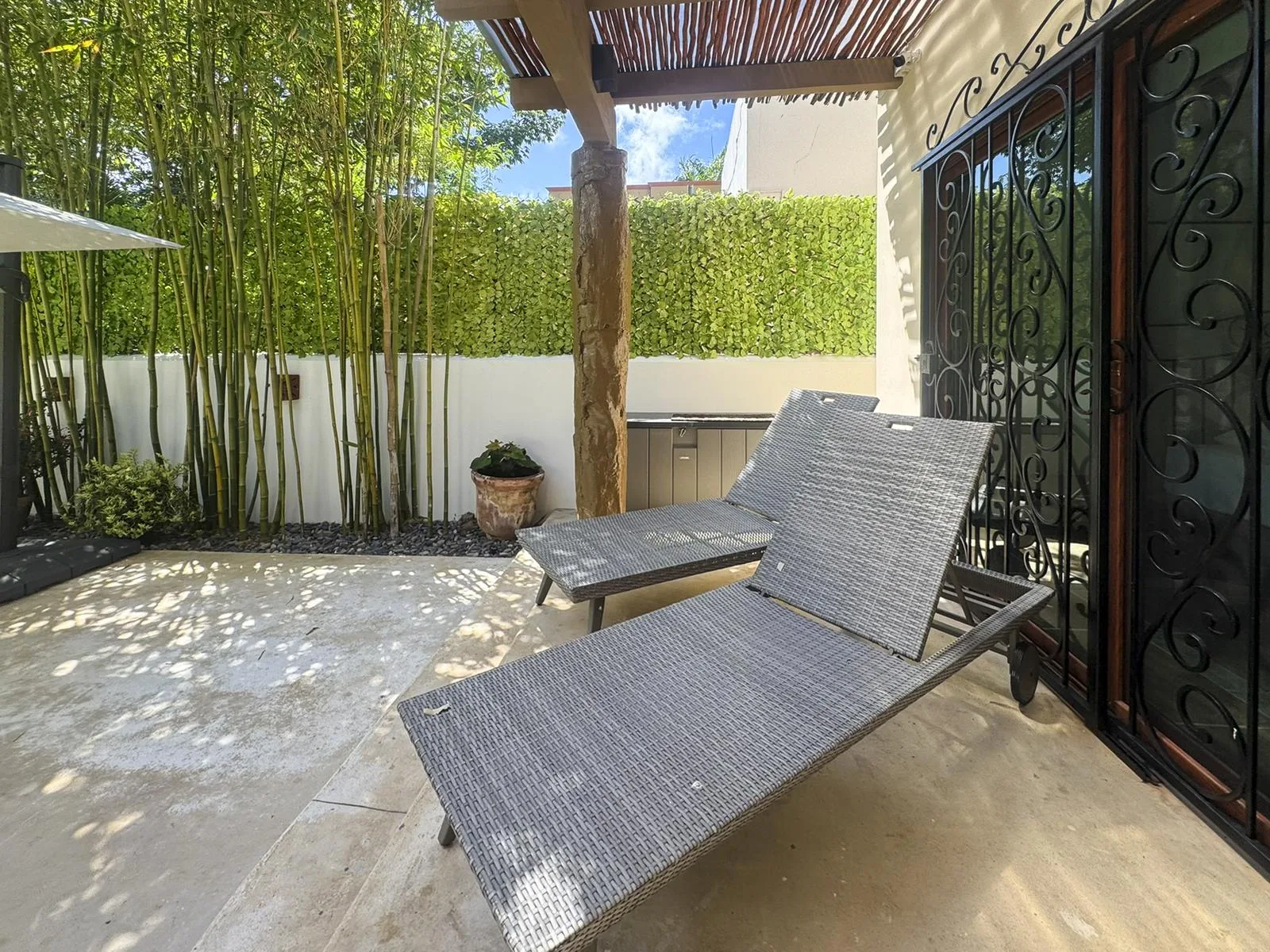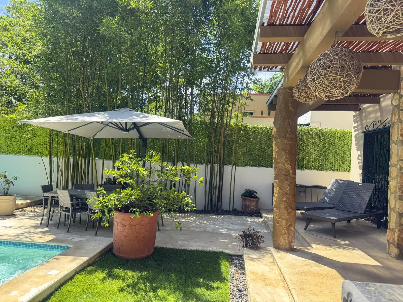 The outdoor area functions as a private tropical oasis with sliding glass doors opening to an expanded swimming pool surrounded by lush vegetation. The space includes an outdoor dining area, sun loungers, and a grill area, ideal for enjoying the Caribbean climate.