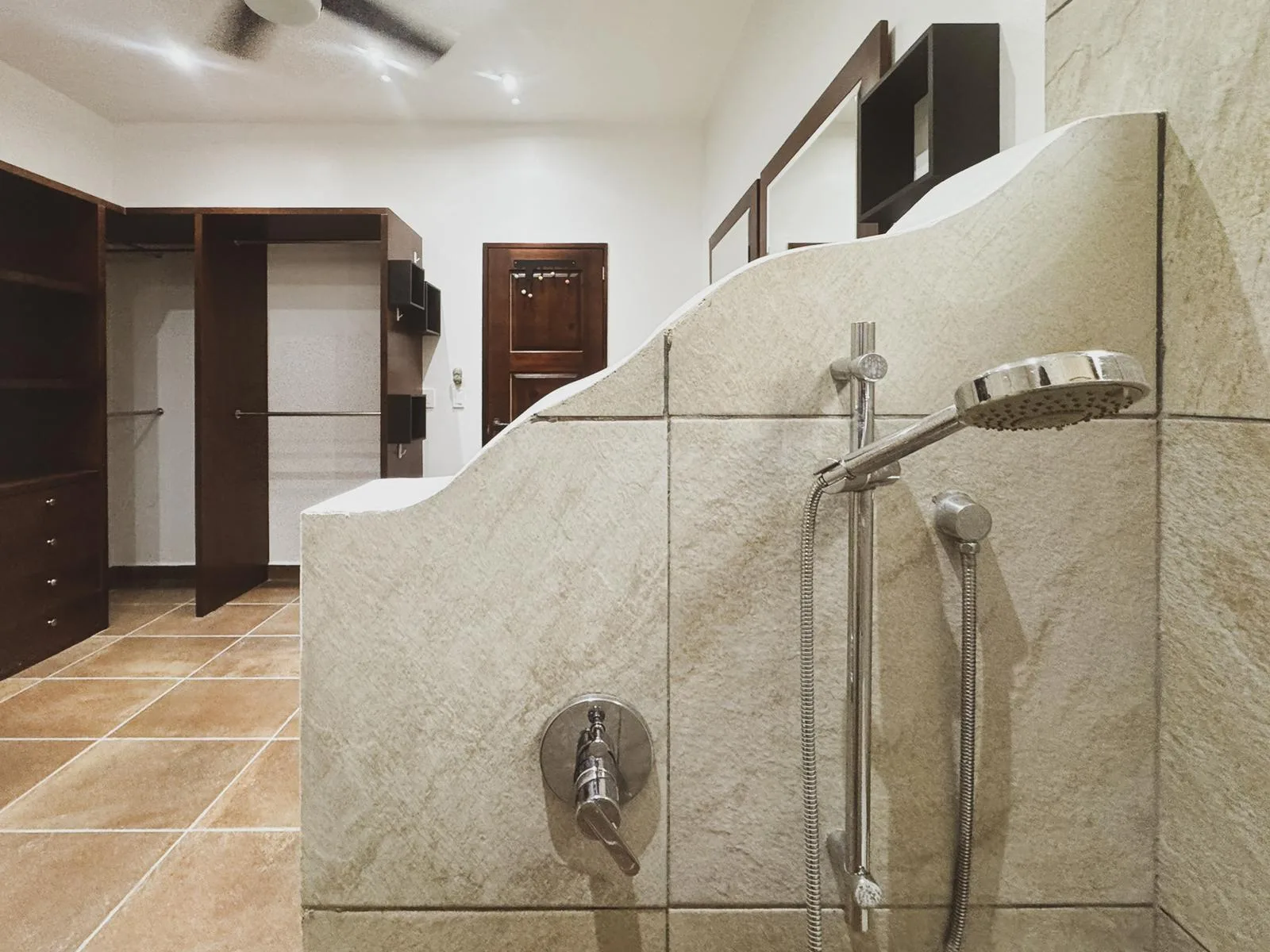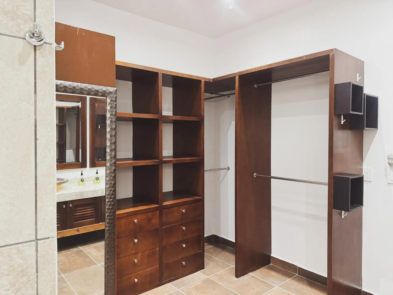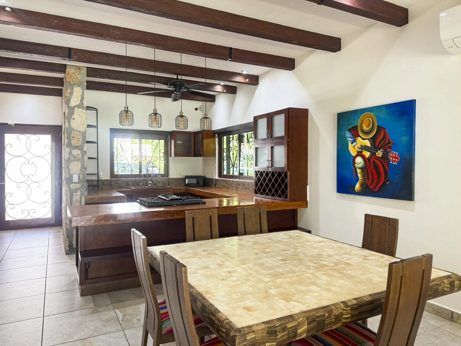 The home features an open-concept design that seamlessly integrates the kitchen, dining area, and living room. It is finished with hacienda-style details, solid wood carpentry, and artisan touches. A half bathroom is conveniently located on the main level. The primary bedroom is situated on the ground floor for privacy and includes a full ensuite bathroom, a walk-in closet, and direct access to the backyard garden.