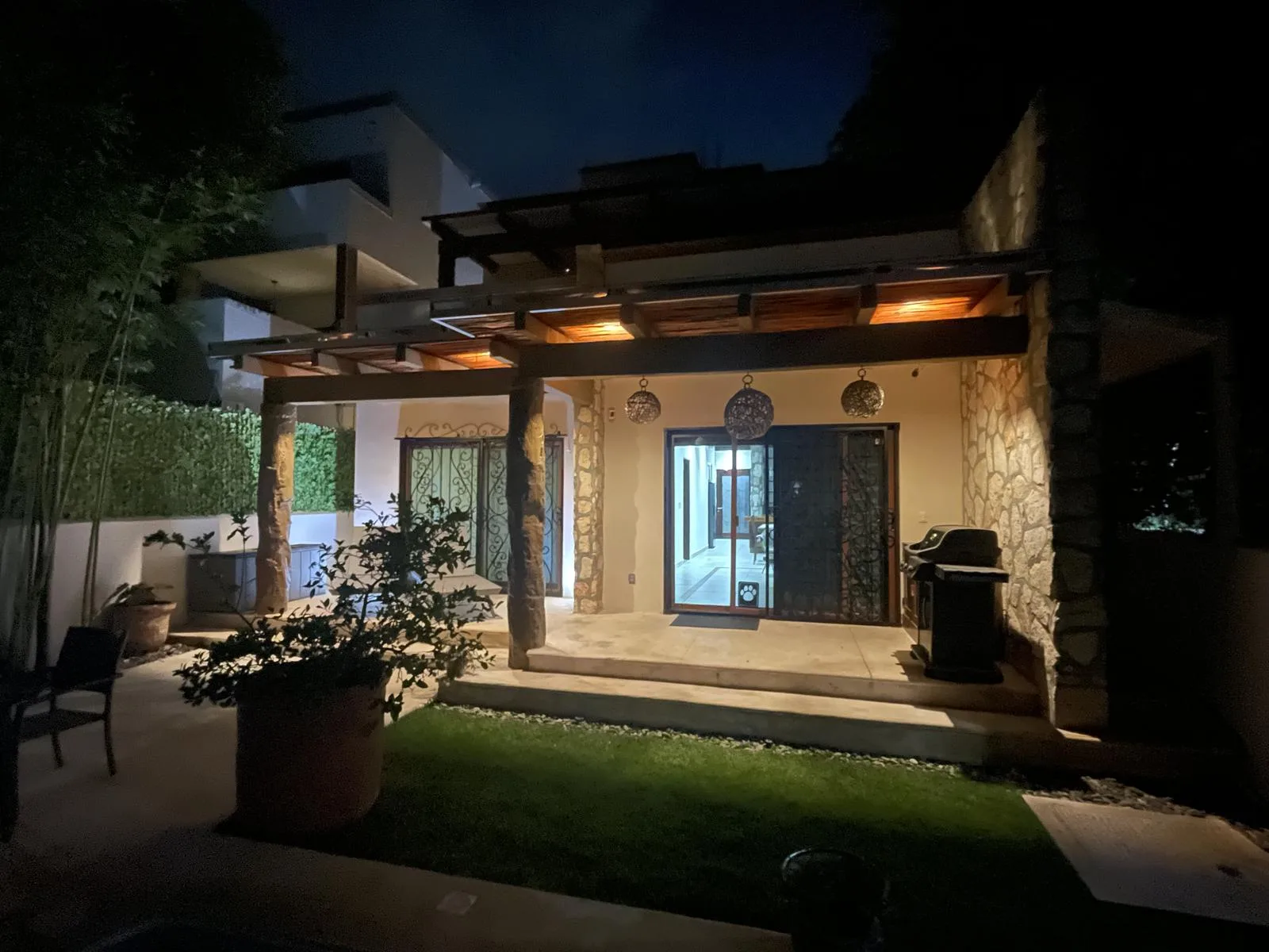 Additional property features include covered parking, a large storage room housing a second refrigerator, a water softener, filters, and a UV purification system. The home has a reverse osmosis system at the kitchen sink and refrigerator, an automatic 18 KW generator with smart power transfer, and two separate gas tanks for the kitchen/grill and the generator. Exterior lighting, pool pump and lights are Wi-Fi controlled. A security camera system and alarm are installed, and ample integrated storage is found throughout the house.