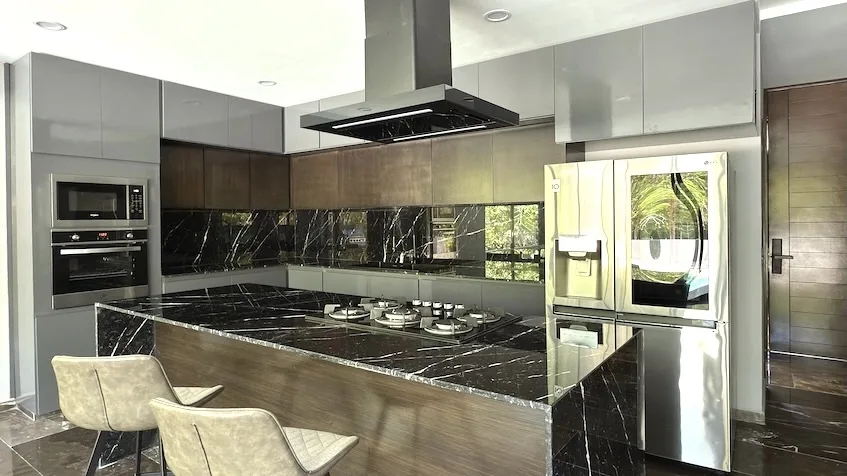 This particular residence offers 407 square meters of construction with open spaces, abundant natural light, and seamless indoor-outdoor flow. The ground floor includes covered parking for two vehicles, a fully equipped kitchen with a breakfast island and marble surfaces, and integrated living and dining areas with floor-to-ceiling windows. A glass atrium with double-height ceilings leads to a large covered terrace with a lounge area and a private swimming pool surrounded by tropical vegetation. Also on this level is a bedroom or study with a walk-in closet and full bathroom, a service room, and a laundry area.