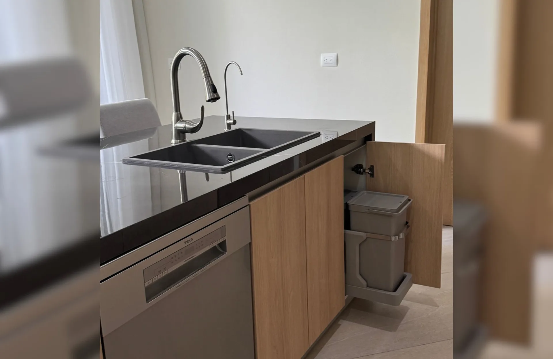 The ground floor includes a living room, dining room, and an open-concept American-style kitchen. It also features a guest bedroom, a tropical garden, a covered terrace with a barbecue grill, and a multifunctional room adaptable for service quarters or other purposes.