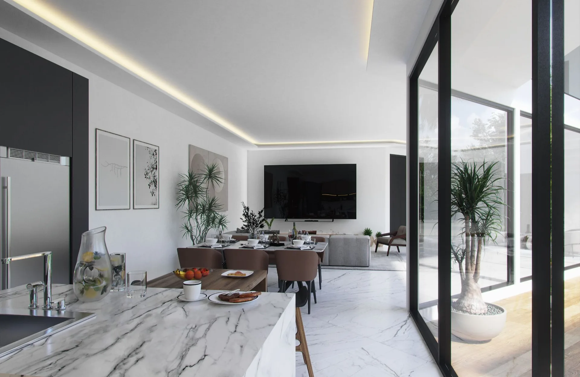 The bright villa is designed to take advantage of natural light and offers panoramic views of the nature preserve. It features a 10-meter-long private swimming pool, private parking for three cars, a service room, and a laundry room.