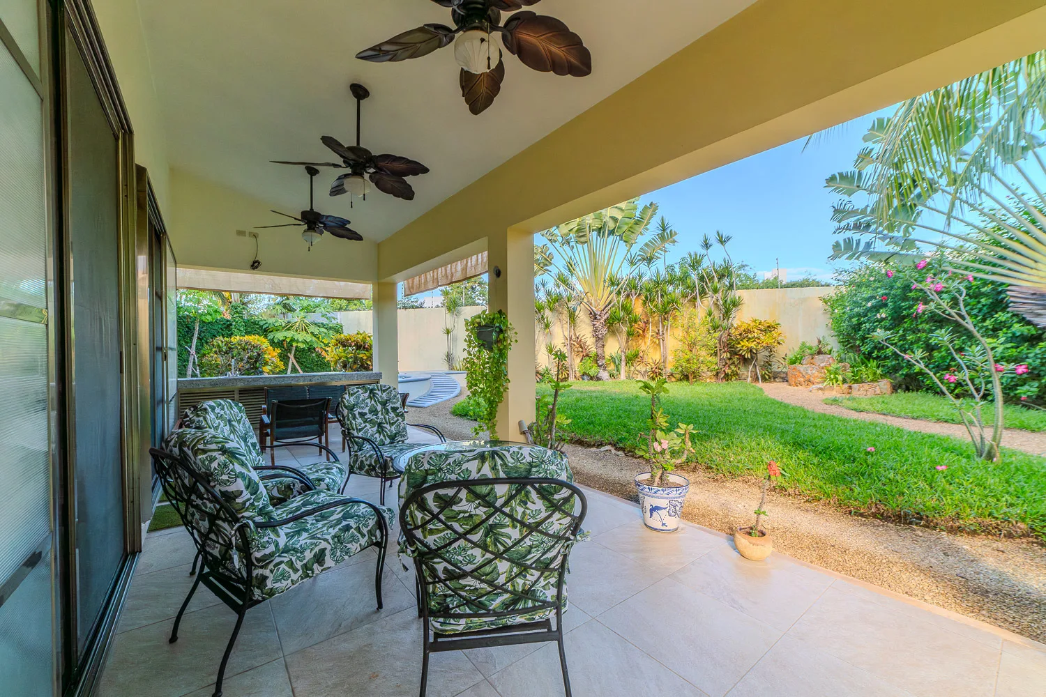 The outdoor space includes a large jacuzzi, a barbecue area, a spacious garden with greenery and fruit trees, and a covered terrace.