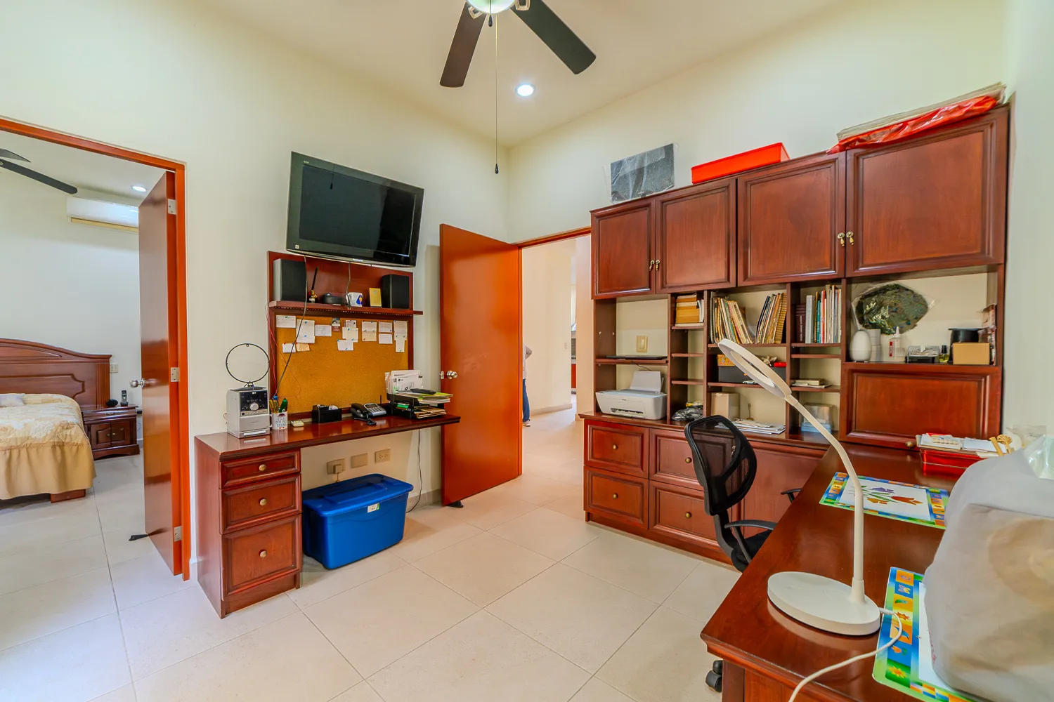The main floor features two bedrooms, each with its own private bathroom. There is a private office, a spacious kitchen with a pantry, and a large living and dining area. An integrated bar area and a service or laundry room are also present.