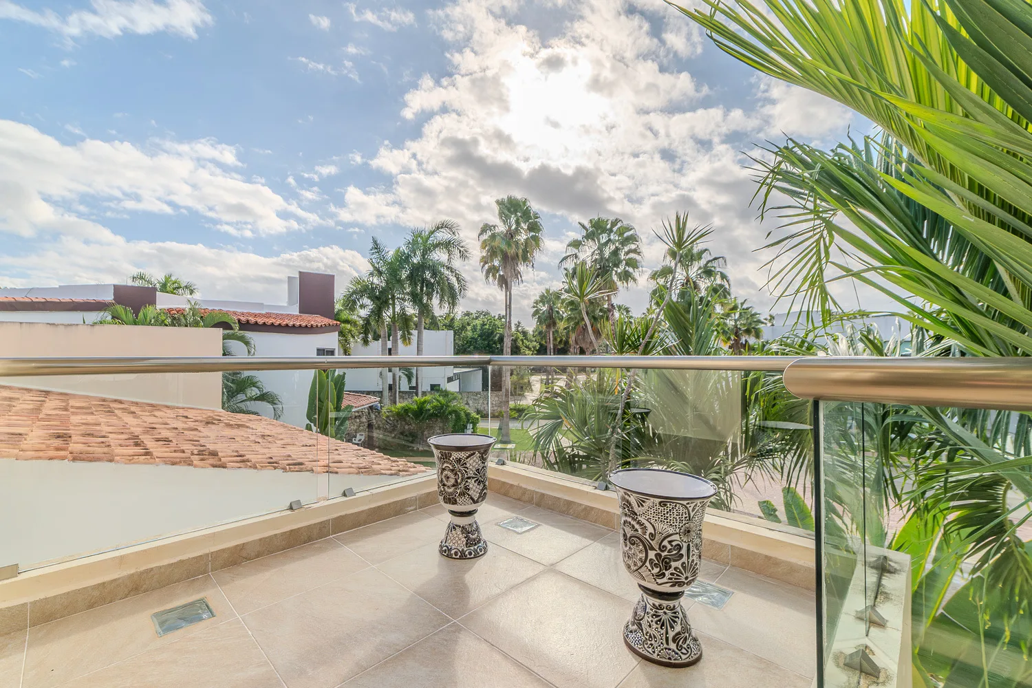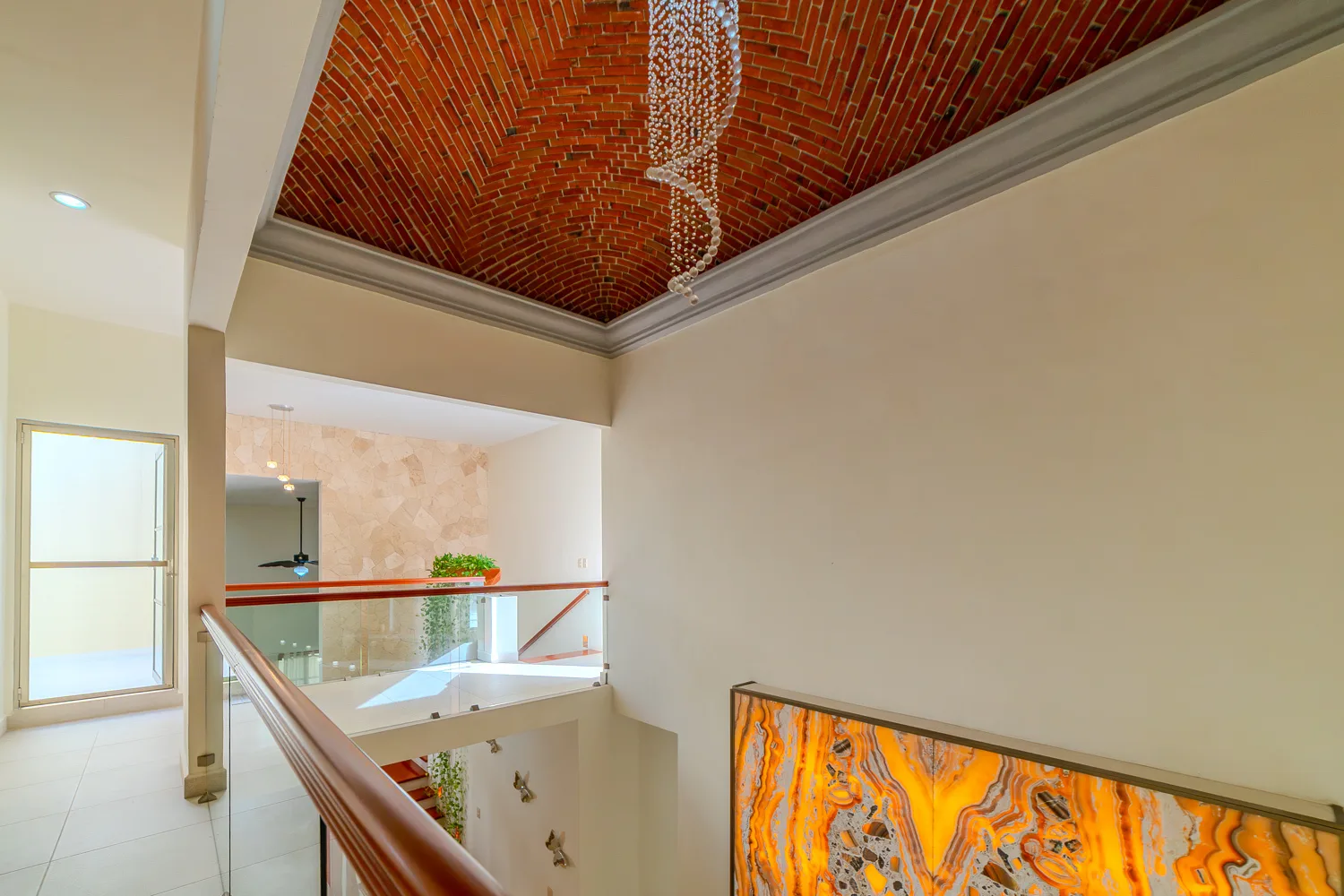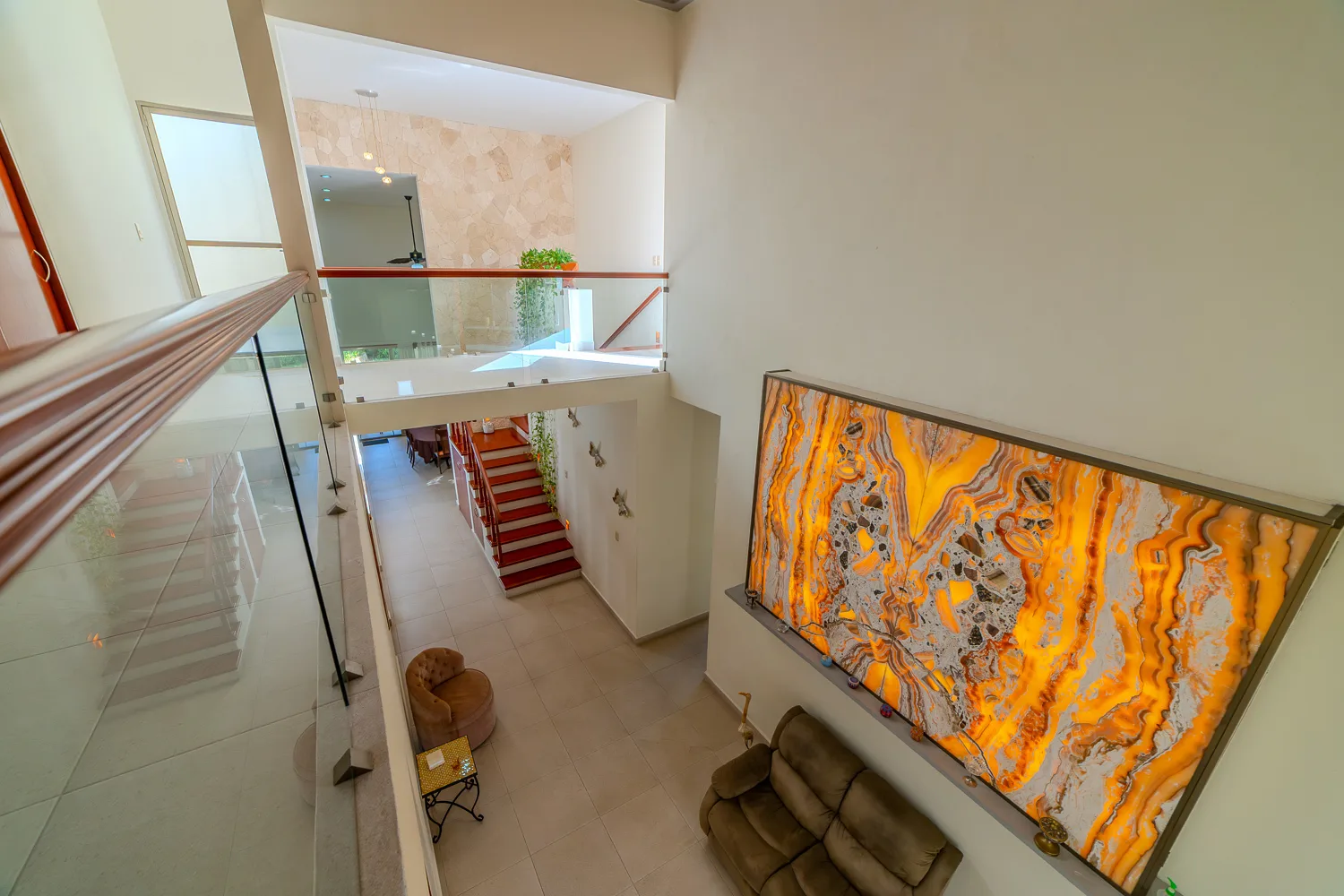 On the second floor, there are two additional bedrooms, each with a private bathroom, a comfortable family room or library, and terraces and balconies with views.