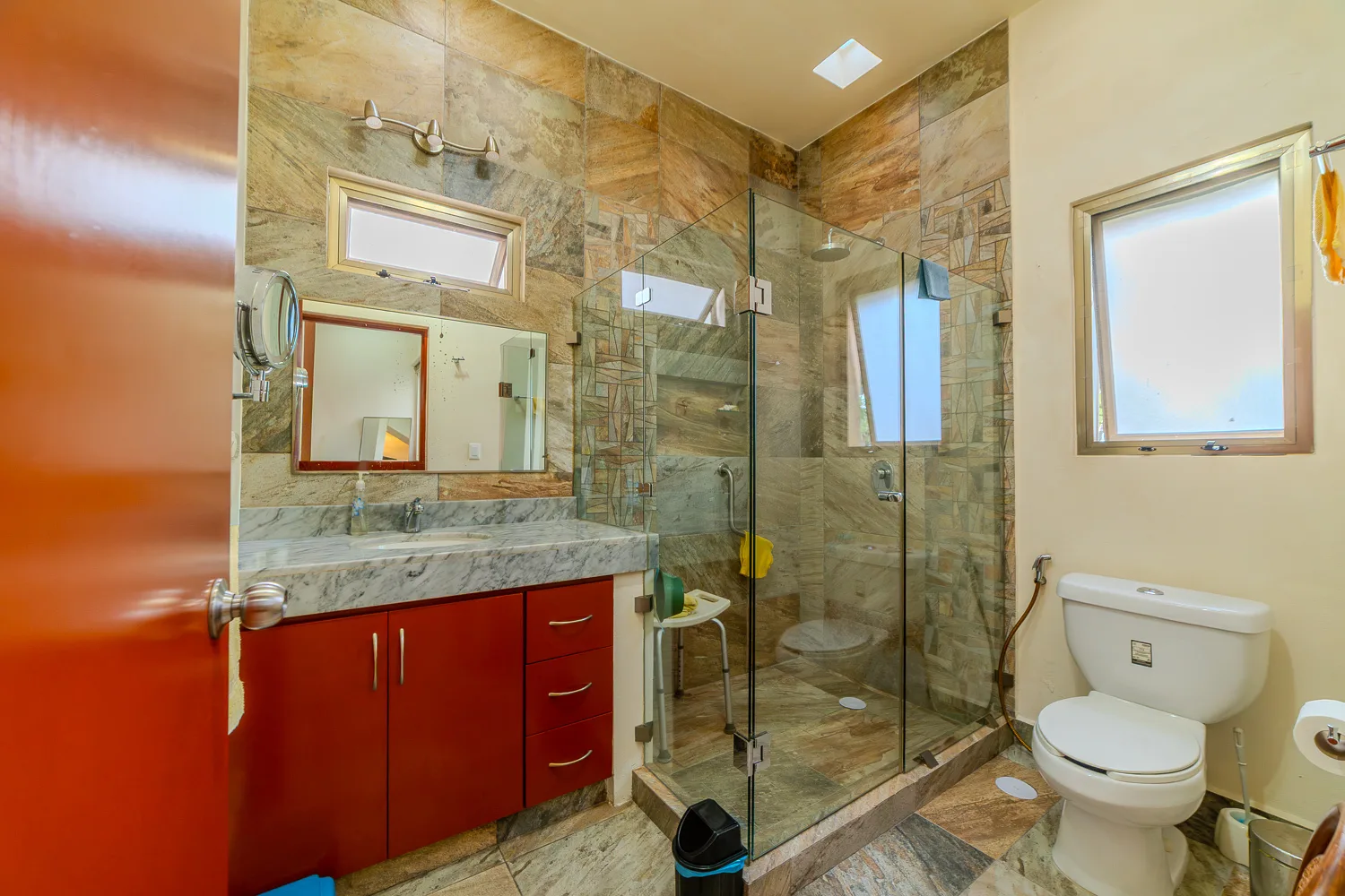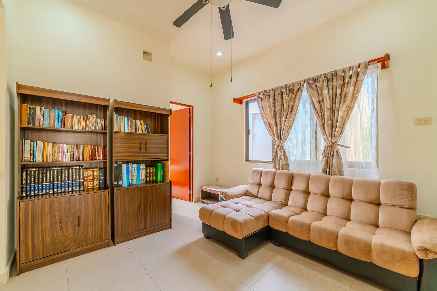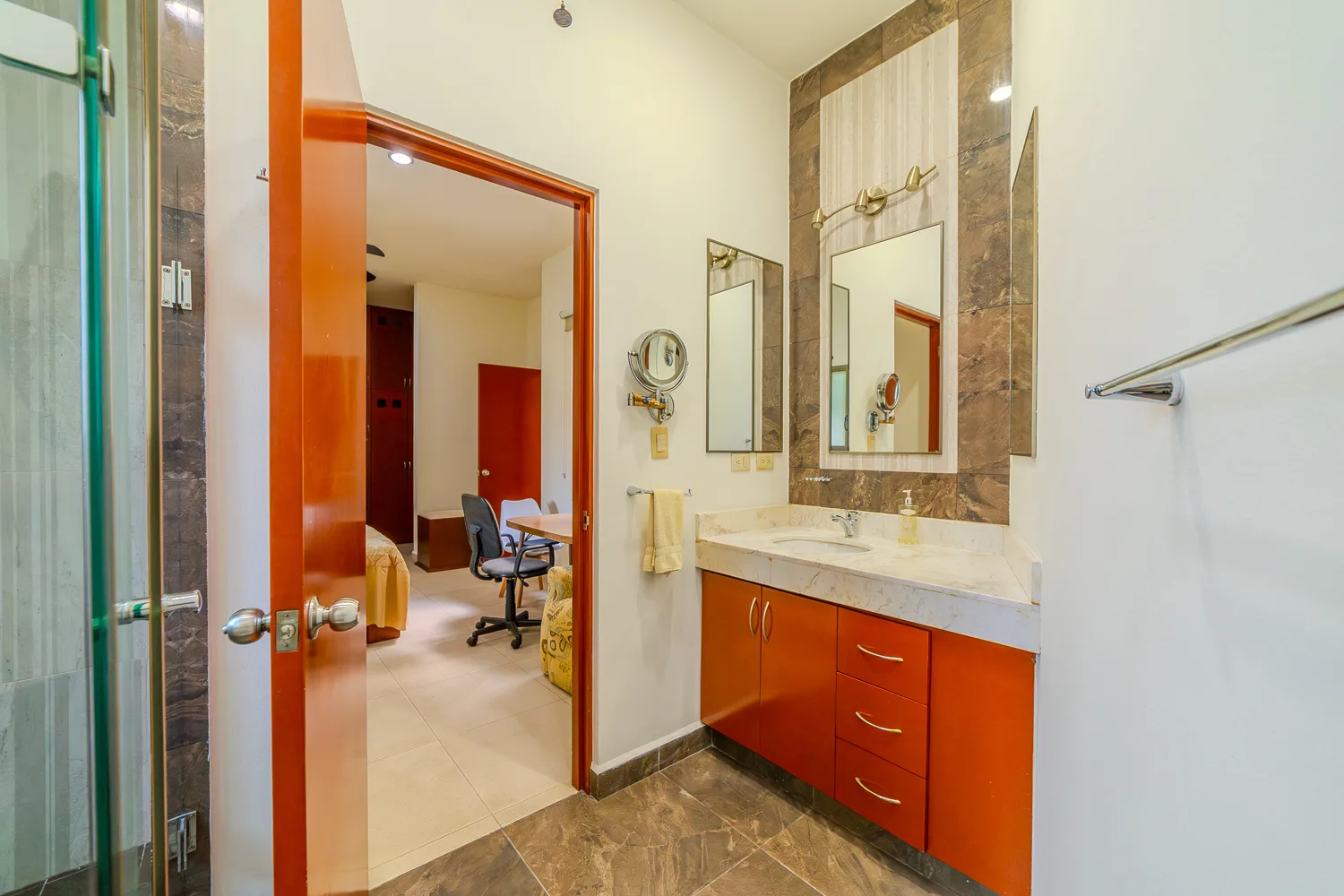 On the second floor, there are two additional bedrooms, each with a private bathroom, a comfortable family room or library, and terraces and balconies with views.