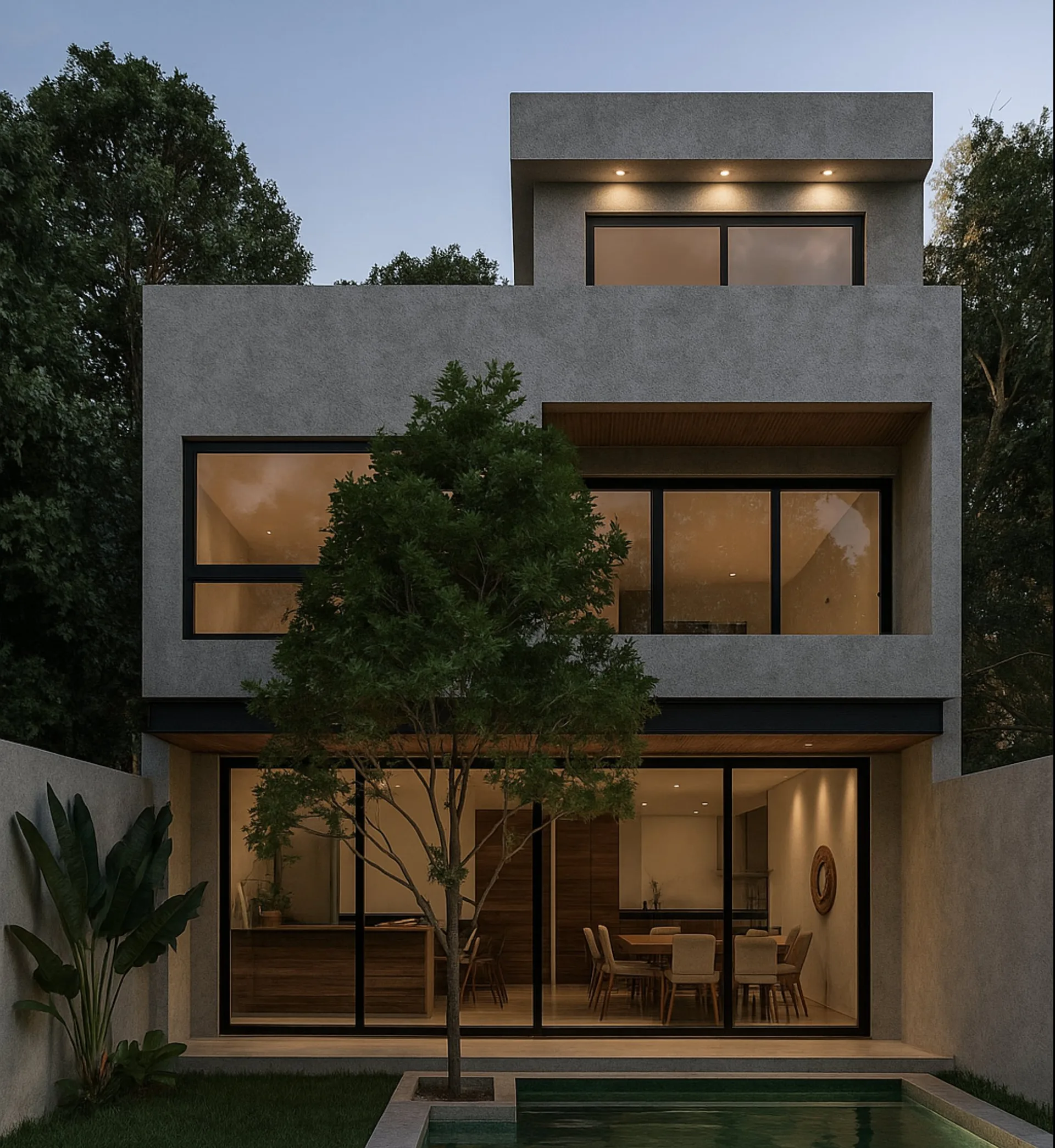 The lot size is 1, 766 square feet with a construction area of 3, 304 square feet. The first floor comprises a living-dining room and an integral kitchen equipped with a granite bar. Also on this level is a bedroom with a full bathroom, a half bathroom for visitors, a storage area, a garden with a private pool, and the two-car parking space.