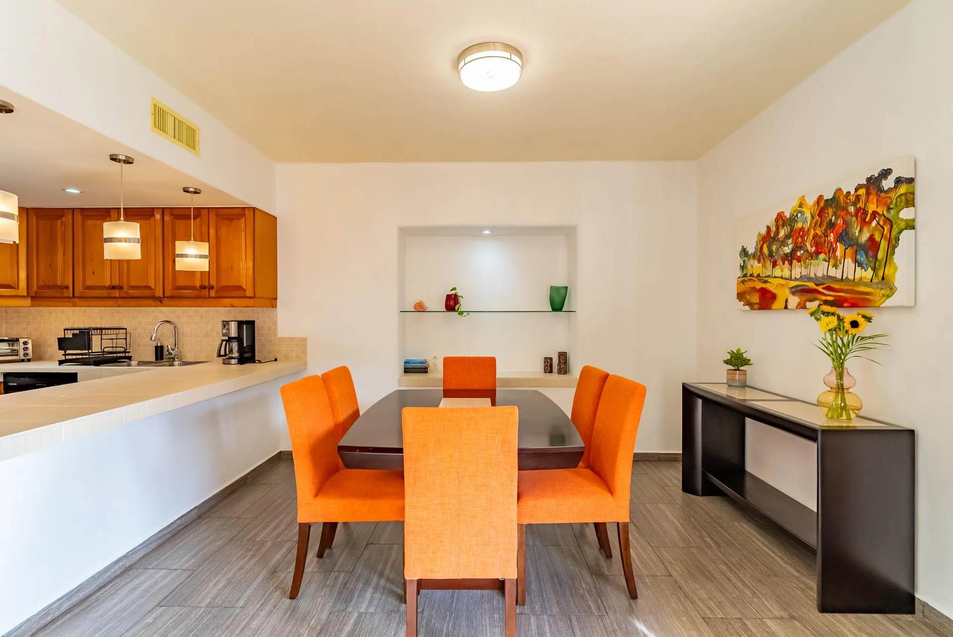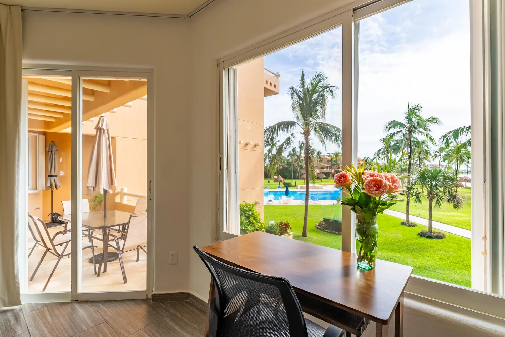 The residence offers an open terrace that facilitates a comfortable indoor-outdoor living experience. The condominium features large common spaces, two large infinity pools, and landscaped gardens.