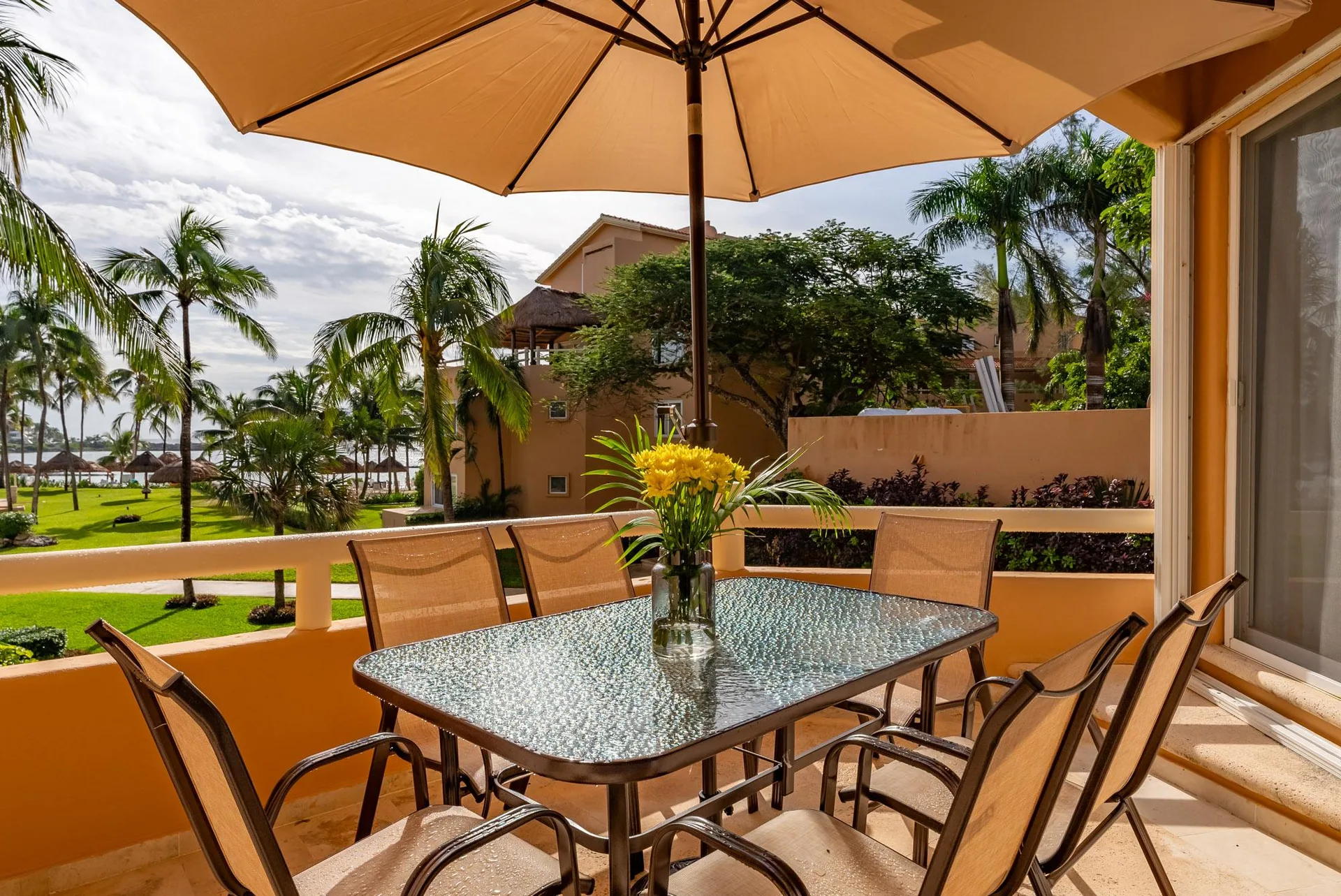 Villa Aqua is located in the Villas del Mar beachfront condominium within Puerto Aventuras on the Riviera Maya. The building is noted for its solid construction and generous finishes. The property benefits from a white sandy beach area with palapas, situated along the protected curve inside the Bay of Fatima where the waters are consistently calm.