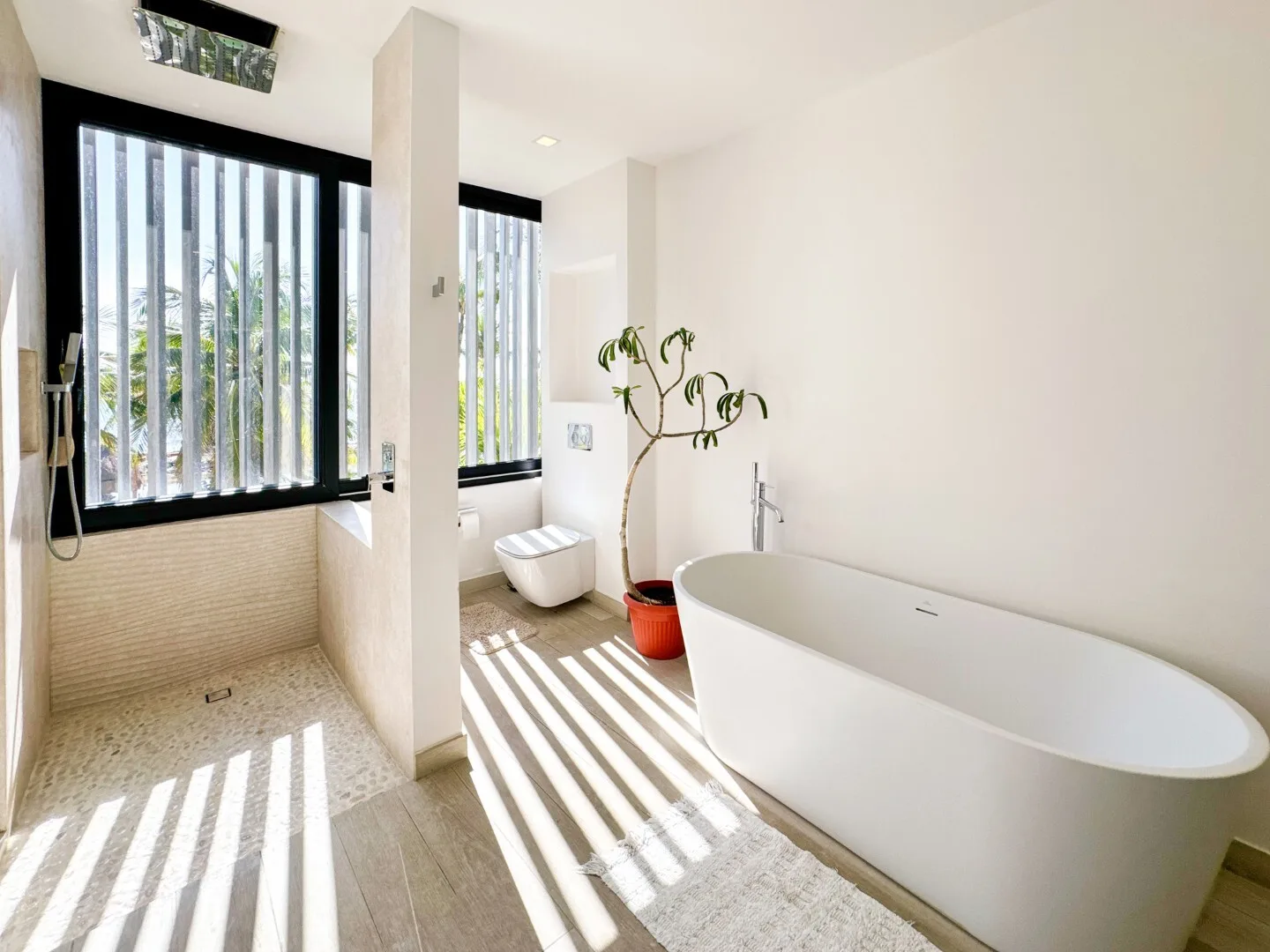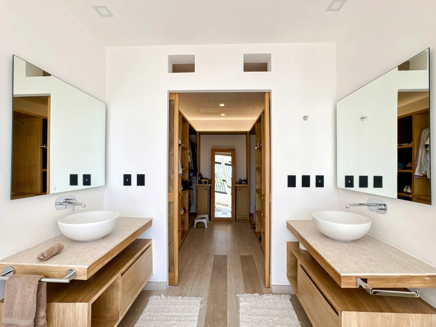 The primary suite upstairs features a private sea-facing terrace and a spa-style ensuite with an ocean-view soaking tub and a separate walk-in shower. The kitchen is equipped with Miele appliances, porcelain countertops, custom soft-close cabinetry, and an osmosis water filtration system. Polished marble or porcelain flooring and warm wood accents are found throughout.