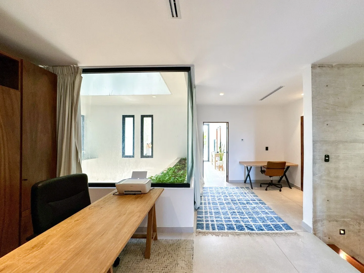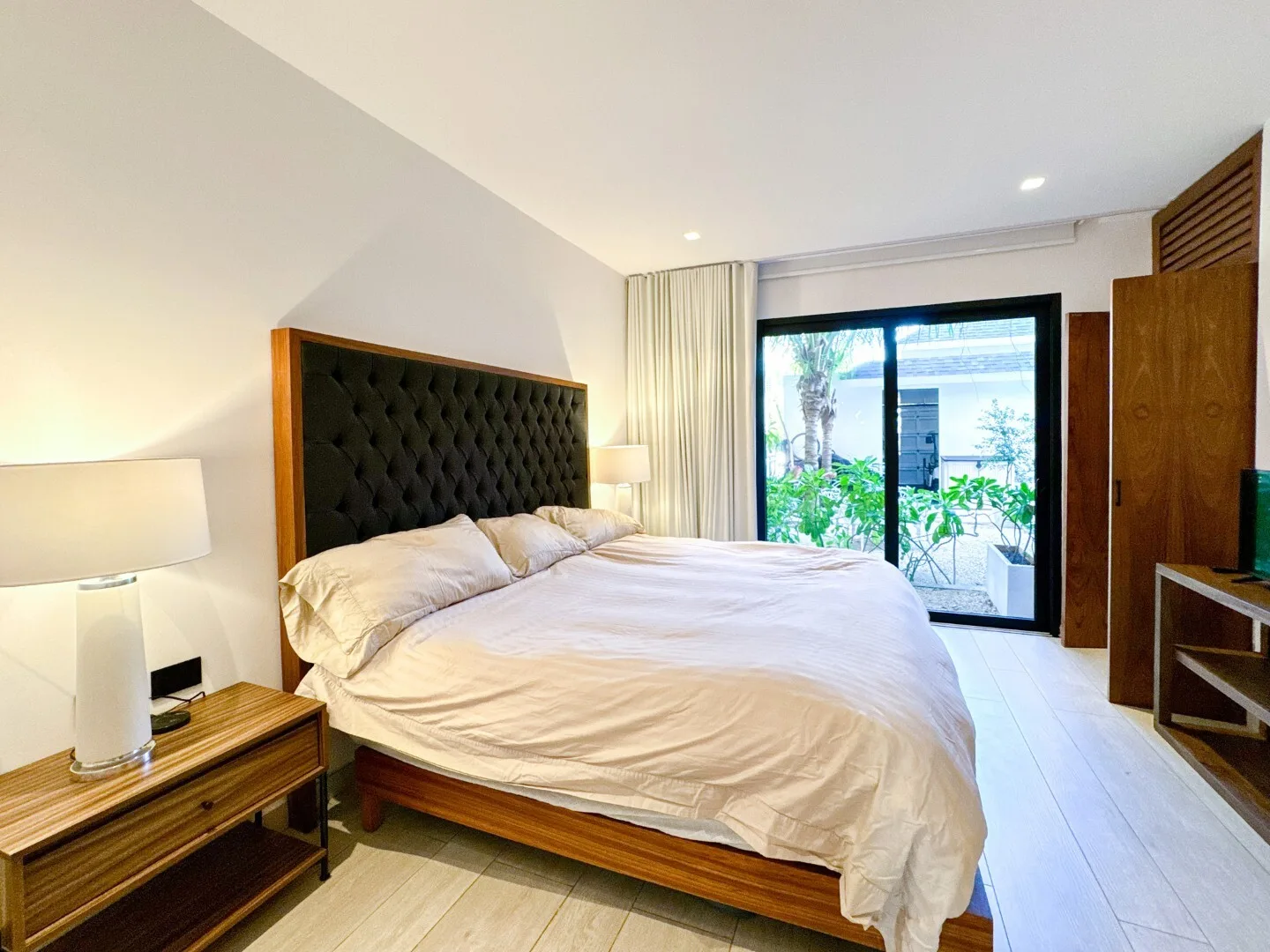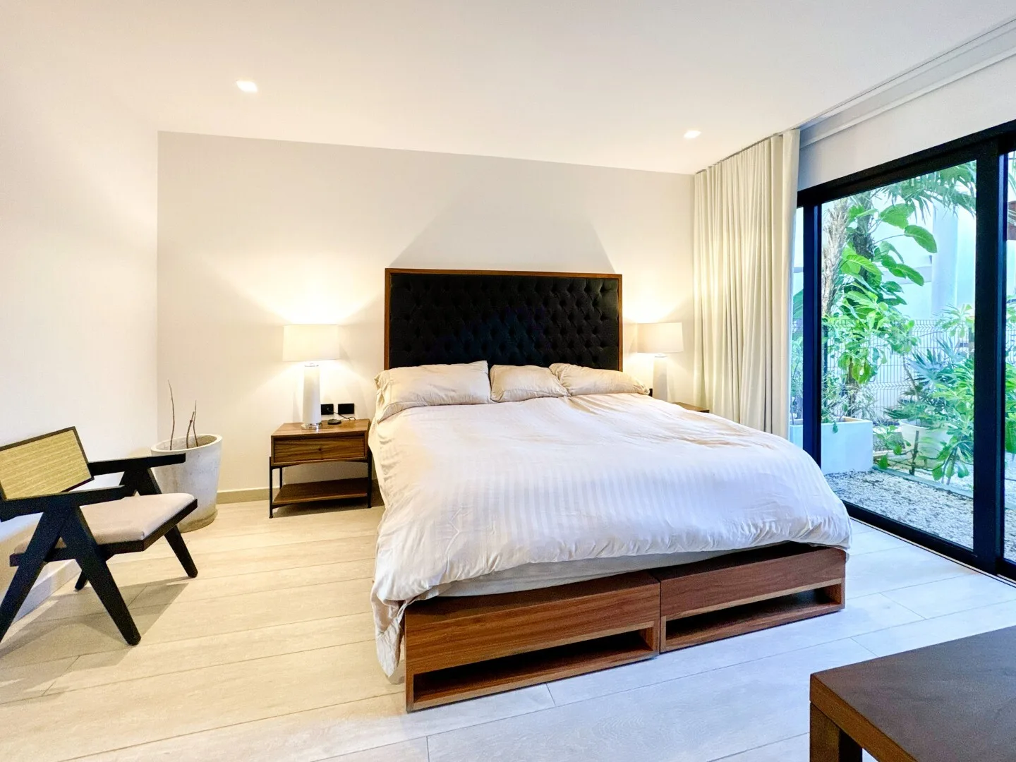 There are three spacious bedrooms, each with its own ensuite bathroom, outdoor space, and generous storage. One bedroom is on the ground level with garden views. The residence includes 3. 5 bathrooms in total, plus a dedicated office or media room with a queen Murphy bed for flexible use.