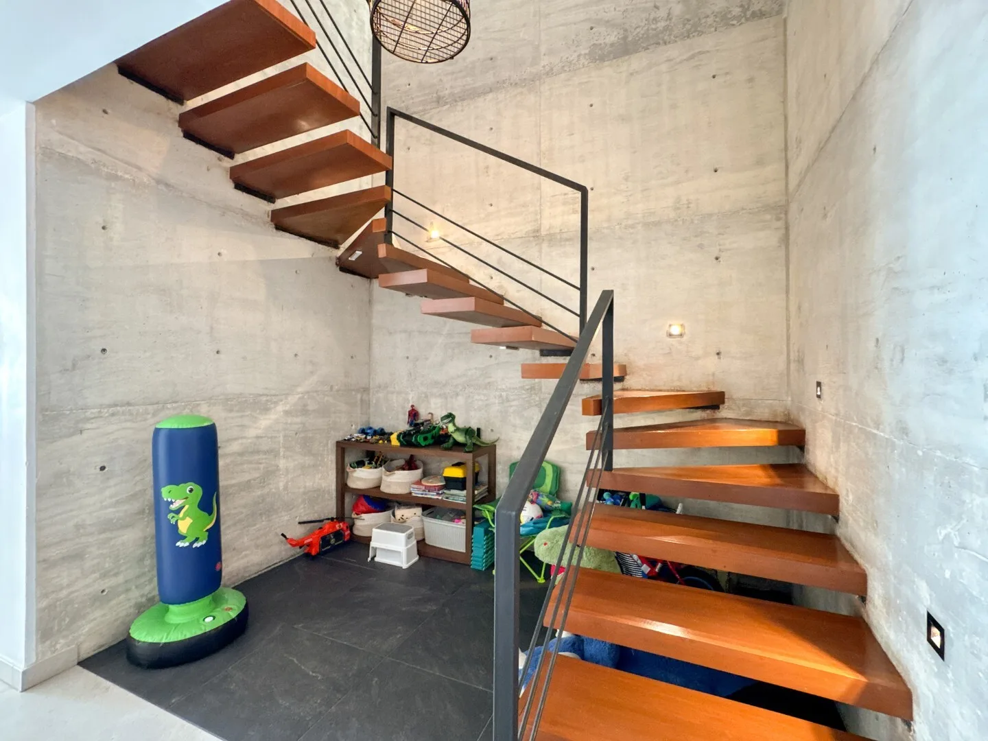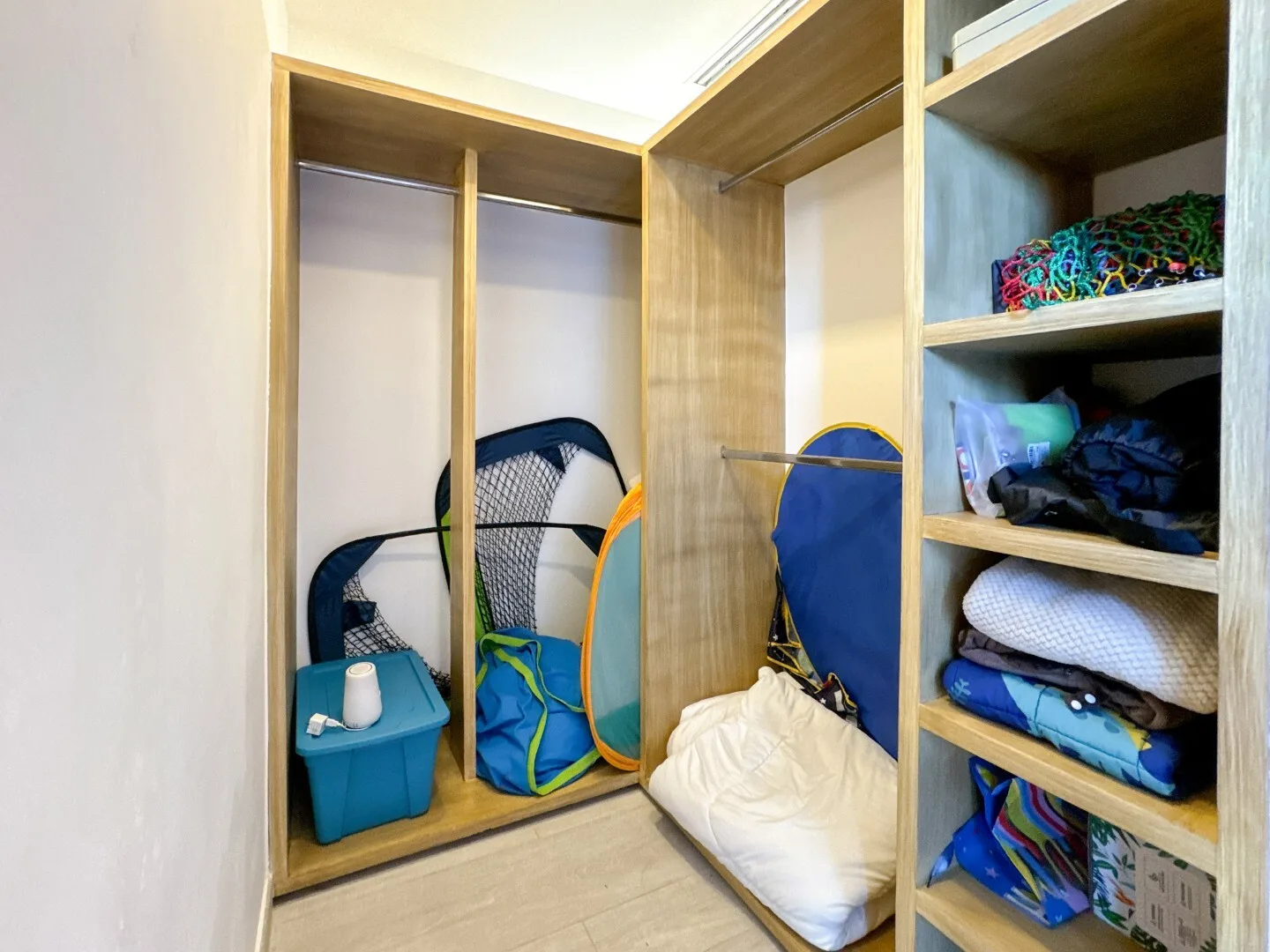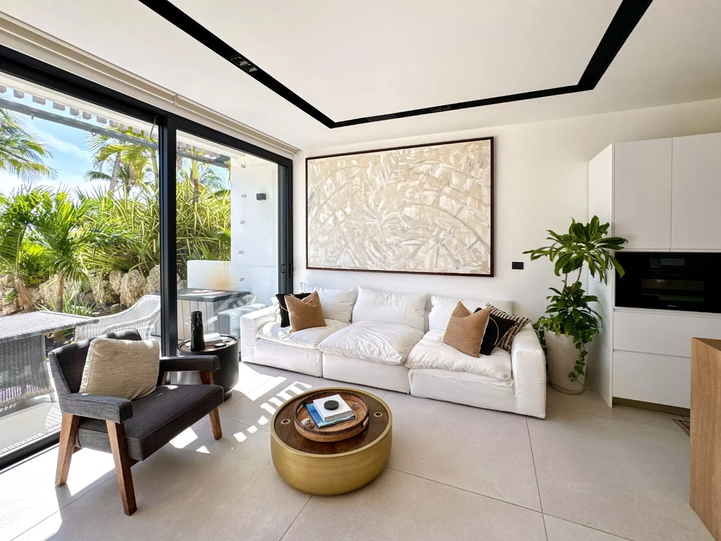 There are three spacious bedrooms, each with its own ensuite bathroom, outdoor space, and generous storage. One bedroom is on the ground level with garden views. The residence includes 3. 5 bathrooms in total, plus a dedicated office or media room with a queen Murphy bed for flexible use.