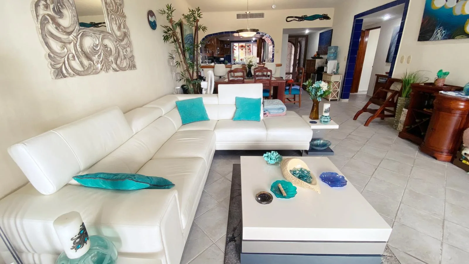 This sea-front condominium for sale in Puerto Aventuras is located within the Quinta Luna residential community. Positioned between the Caribbean Sea and a private lagoon, it offers a combination of tranquility, security, and natural beauty.