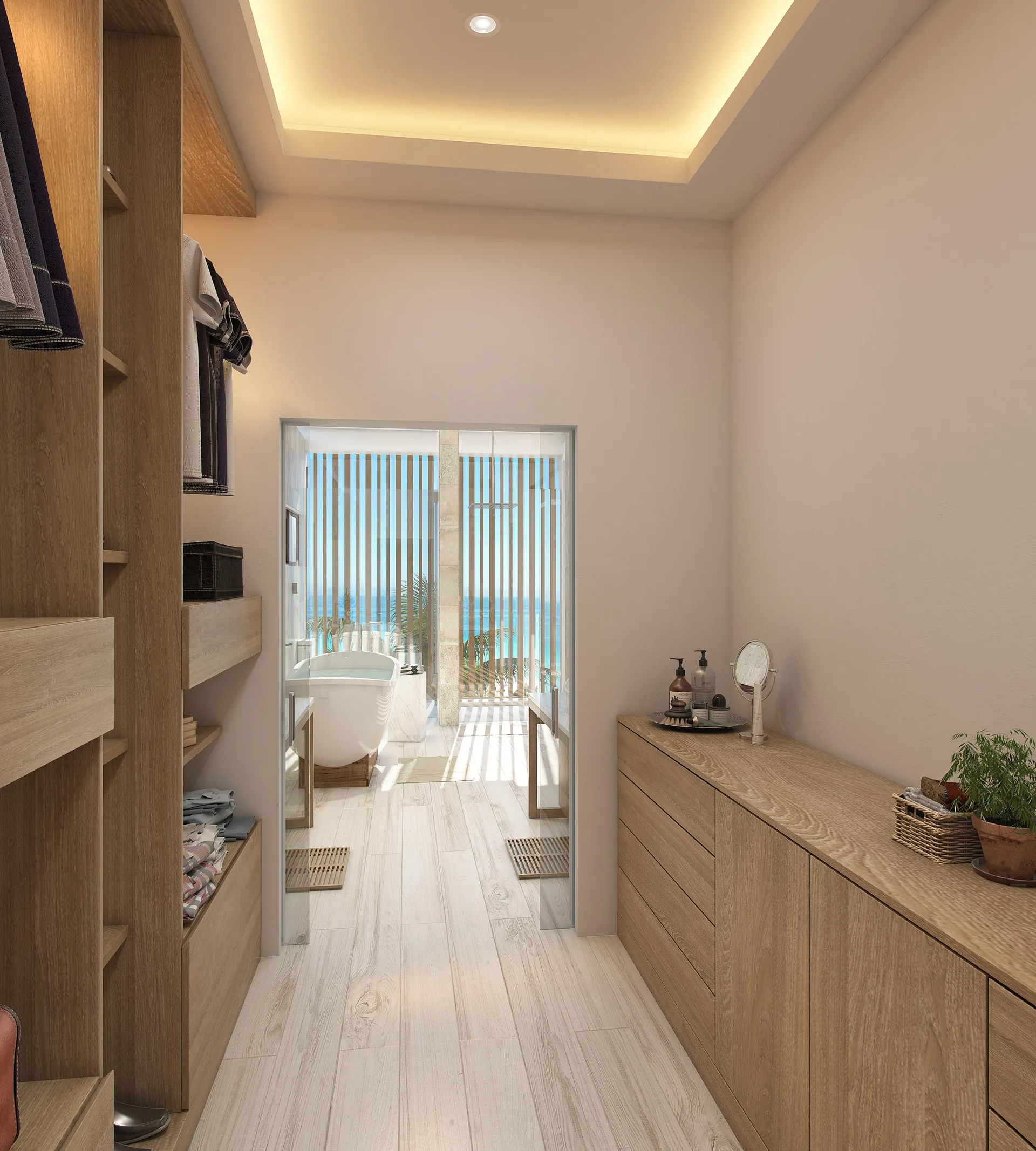 The primary bedroom on the first floor features a large terrace with views of the pool and the ocean. It includes a spacious bathroom with an impressive view from the shower, a separate WC, a tub area for relaxation, and a walk-in closet. A private office is equipped for digital connectivity. A practical laundry center is also located on this floor. The entertainment room is designed for high-quality digital enjoyment. The second bedroom is comfortable and spacious, featuring a full bathroom, a walk-in closet, and a terrace.