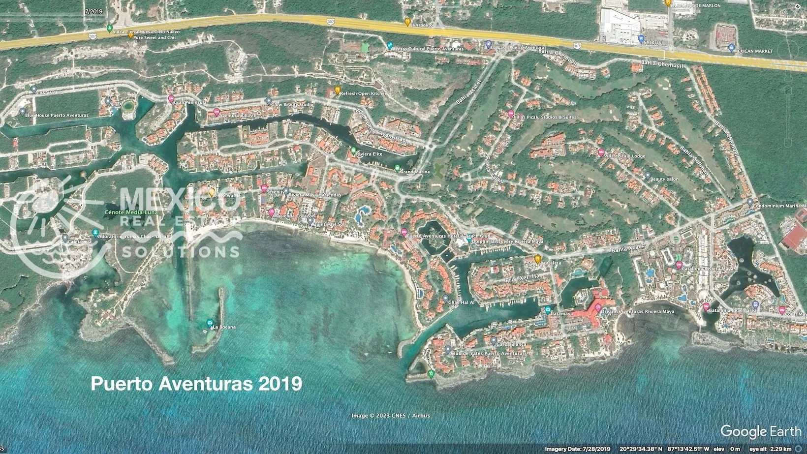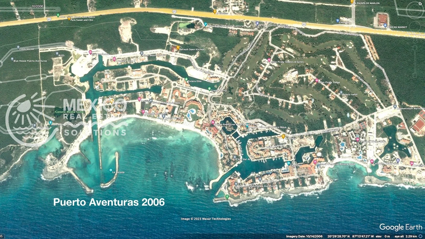 Puerto Aventuras is located between Playa del Carmen and Tulum. It offers gated security, a full-service marina, beaches, dining, and access to outdoor adventures such as cenotes, eco-parks, and scuba diving.