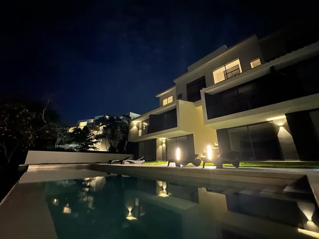 This residential project features a contemporary design that integrates with its natural surroundings. The development focuses on providing spaces for relaxation, entertainment, and sport.