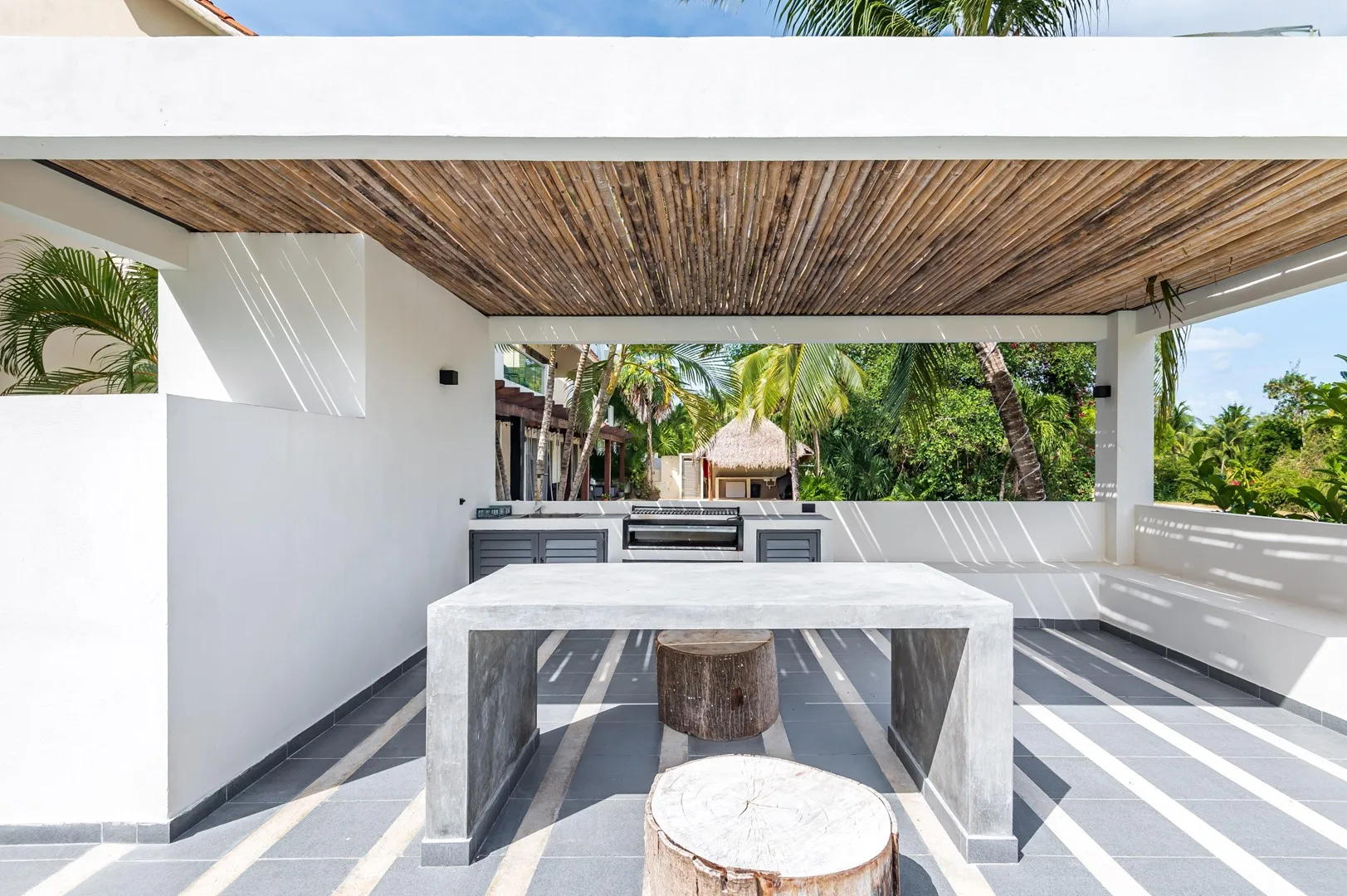 The property is situated in an area characterized by abundant green spaces, wide roadways, and proximity to commercial zones. It offers panoramic views of the Caribbean Sea and the adjacent golf course in Puerto Aventuras.