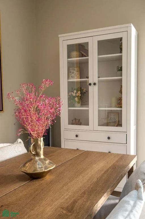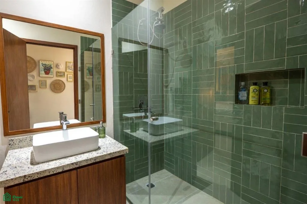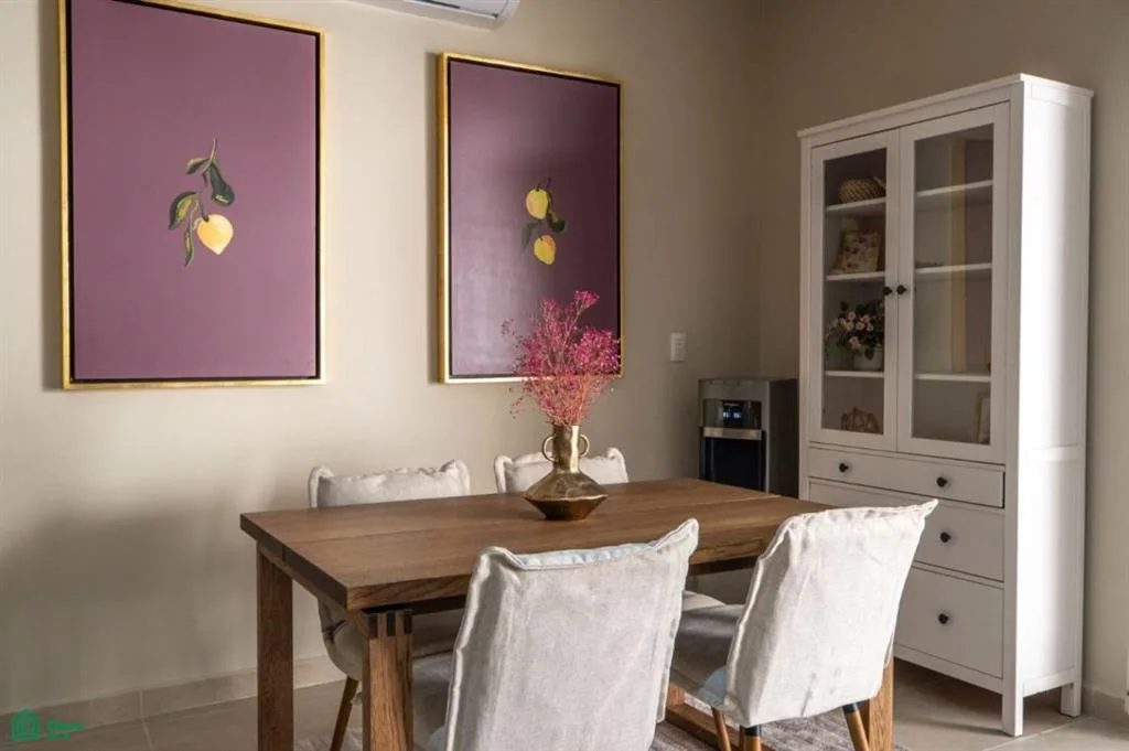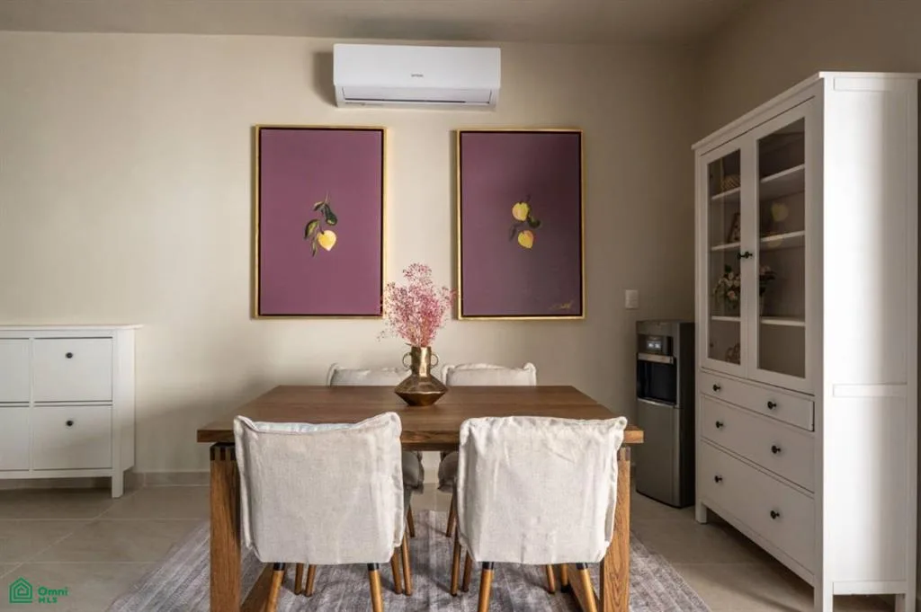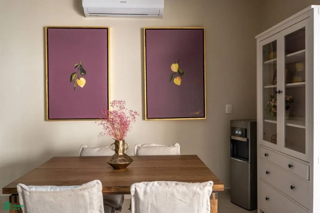 The interior is bright and airy, with a seamless flow from the living and dining area to the terrace and the shared swimming pool. Modern finishes and natural textures create a relaxed, coastal atmosphere, while tasteful decor adds warmth and character. The two full bathrooms have elegant walk-in showers, and a lockable room provides added flexibility for guests or rental use.