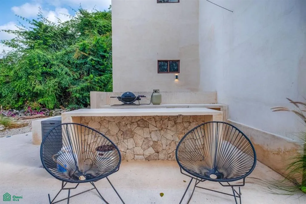 The property offers views of the pool and jungle, a covered terrace, and a built-in barbecue grill and fireplace. It includes a designated parking space. The community is gated with 24/7 access.