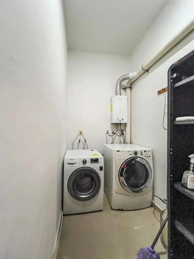 The master bedroom includes a private bathroom, a wooden closet, and electric blinds. The secondary bedroom has a wooden closet and access to a shared bathroom. A full bathroom with a bidet is present, along with a laundry area containing a washer, an electric water heater, and a laundry sink. There is also a ventilated space measuring 1x1 meters, suitable for an interior garden or additional storage.